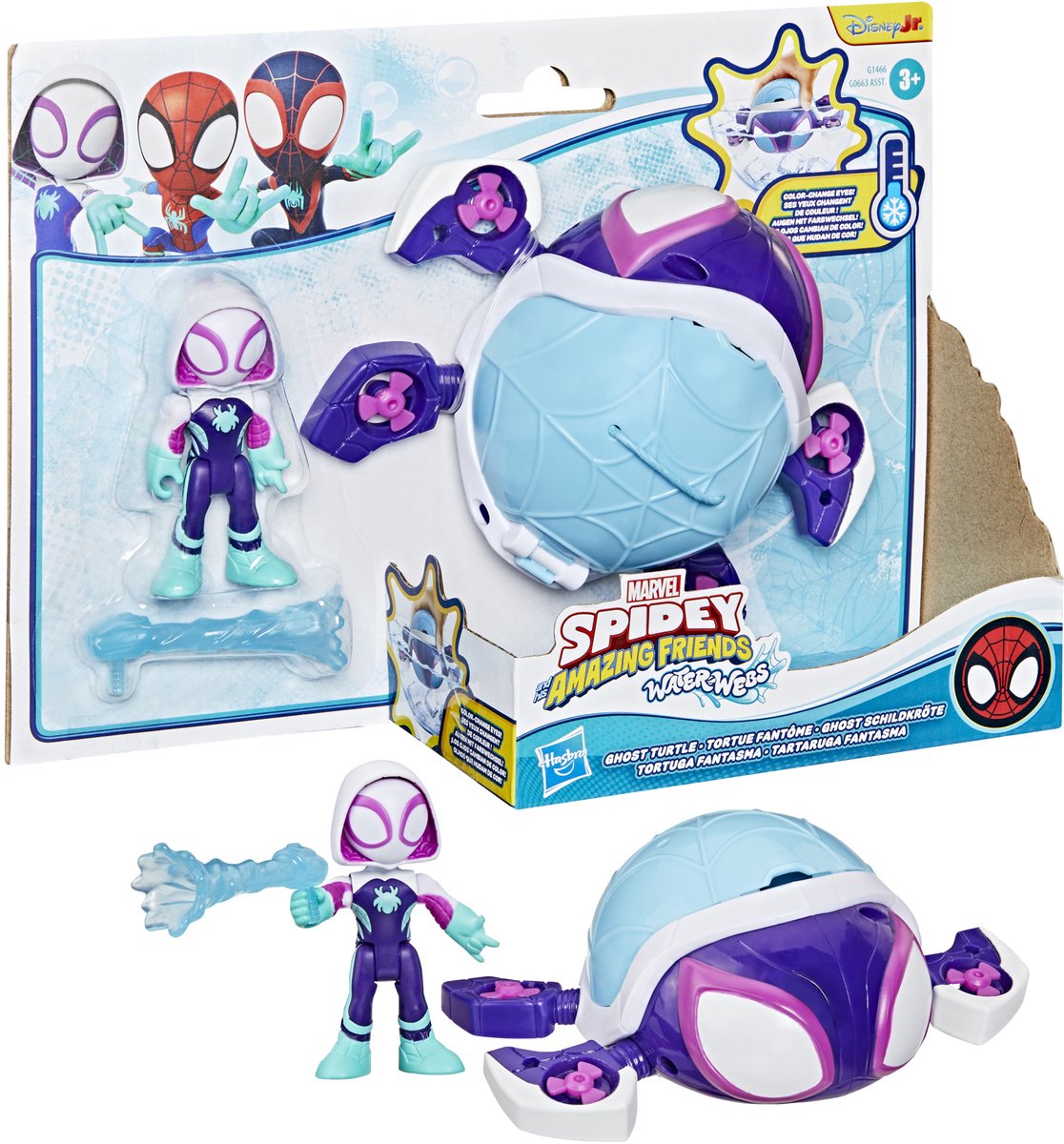 Stel je voor hoe je in actie 'spettert' en avonturen beleeft met het Marvel Spidey and His Amazing Friends Water-Webs Ghost Turtle-speelgoedvoertuig, zoals te zien in bepaalde episodes van Spidey and His Amazing Friends! Deze set met actiefiguur en voertuig van 7,6 cm voor meisjes en jongens bevat een leuk, gestileerd speelgoedvoertuig en een verstelbare Ghost-Spider-actiefiguur. Ontwerp en deco geïnspireerd op de serie Spidey and His Amazing Friends op Disney Jr., plus een pak met bijgewerkte Water-Webs Spider-Man-deco. Bij de Ghost-Spider-actiefiguur hoort ook een afneembaar webaccessoire. Moedig grootse, fantasierijke speelavonturen aan voor kinderen, met meer Spidey and His Amazing Friends-speelgoed van Hasbro, inclusief waterspeelgoed, voertuigen voor actiefiguren en speelsets! (Elk afzonderlijk verkrijgbaar. Zolang de voorraad strekt.)