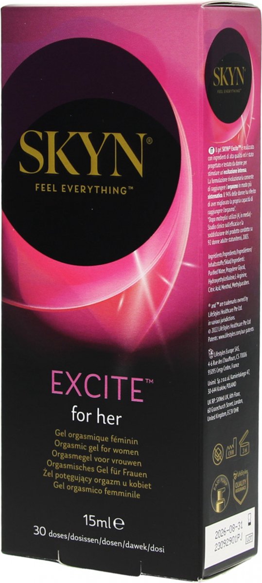 84% van de vrouwen voelde een intenser orgasme en 72% van de vrouwen bereikte sneller een orgasme (Amerikaans onderzoek van de fabrikant met 640 vrouwen die SKYN Excite gebruikten.)Ben je erg gevoelig dan kun je deze gel mogelijk als te sterk ervaren.