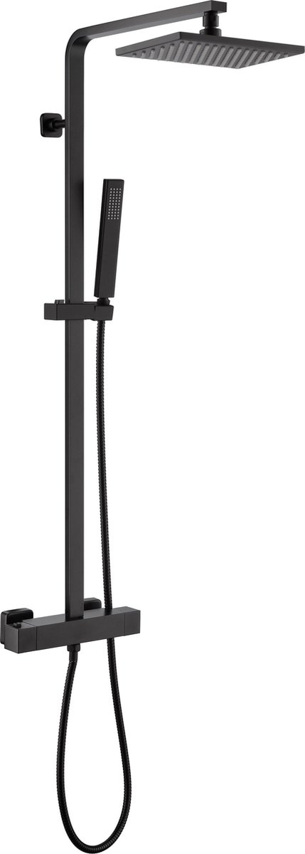 Dit douchesysteem bevat: een thermostatische kraan met cooltouch, een douchestang, een doucheslang, een hoofd- en handdouche en handdouchehouder.
