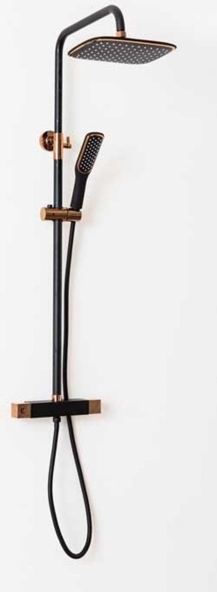 Sanifun douchesysteem Gent Roosgoud ZwartDit douchesysteem bevat: een thermostatische kraan, een douchestang, een doucheslang, een hoofddouche, een handdouche en een handdouchehouder.De hoofddouche is 200 x 200 mm.De handdouche is 68 mm breed en 230 mm lang.De handdouche is in hoogte verstelbaar.De stang is regelbaar in hoogte (890 - 1340 mm).De aansluiting is van het formaat 1/2.De hartafstand van de kraan is 150 mm.Zowel de ... lees meer over dit product
