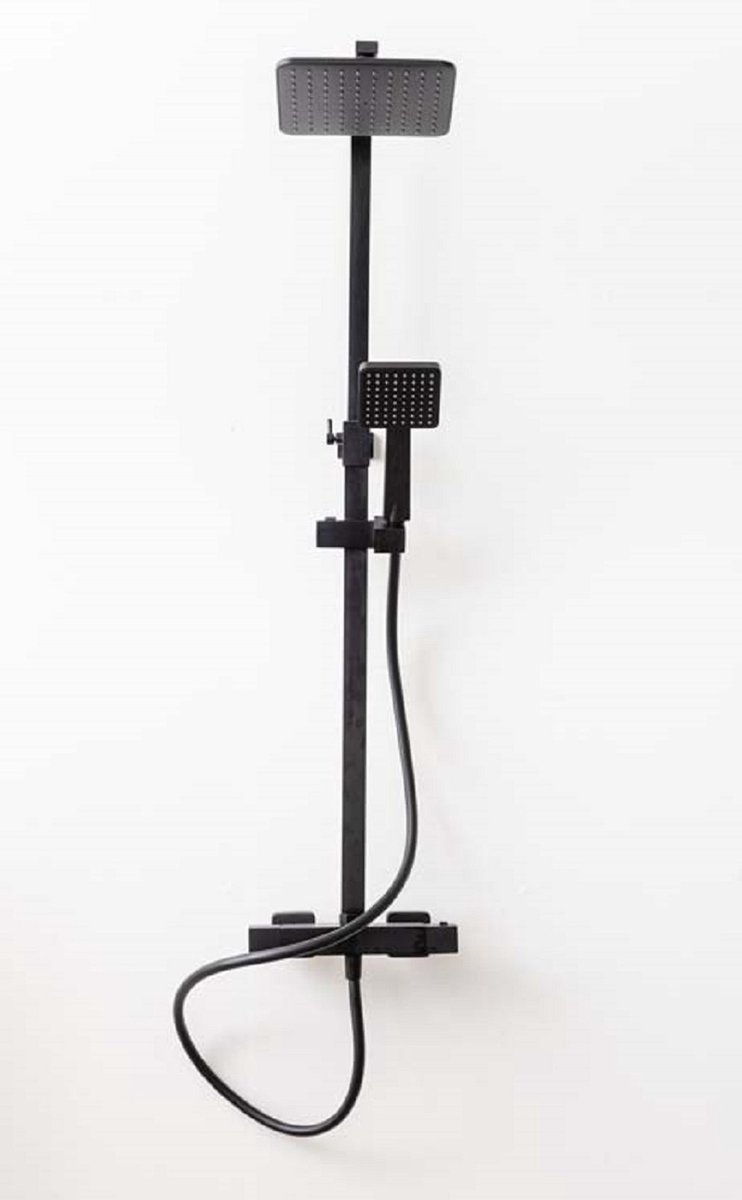 Dit douchesysteem bevat: een thermostatische kraan, een douchestang, een doucheslang (zwart PVC),een hoofddouche, een handdouche en een handdouchehouder.