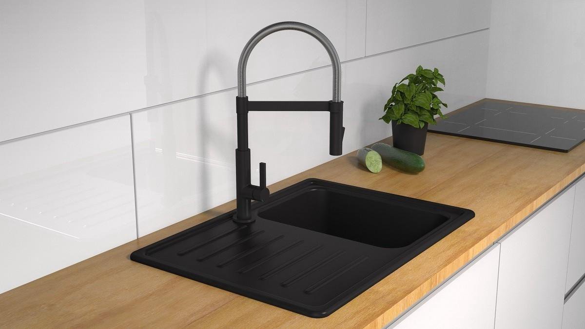 De Schütte keukenmengkraan Miami is gemaakt van messing en deels mat-zwart en deels chroom van kleur.