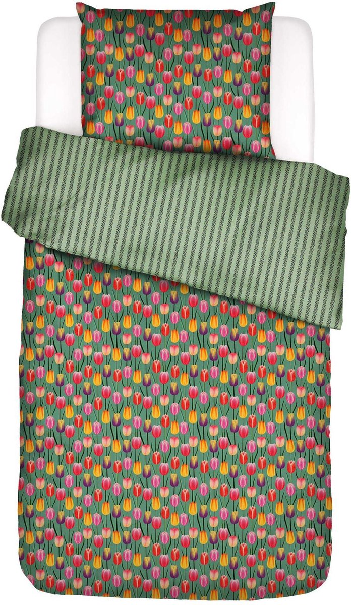 Dit dekbedovertrek van ESSENZA & CO brengt een vrolijke sfeer in je slaapkamer. Aan de ene kant is het dekbedovertrek versierd met een kleurrijk patroon van tulpen in rood, geel, oranje en roze op een frisgroene achtergrond. Deze kant straalt energie en vreugde uit, perfect voor iedereen die een frisse en opgewekte uitstraling wil in hun slaapkamer. De andere kant van het dekbedovertrek biedt een rustgevend contrast met een su... lees meer over dit product