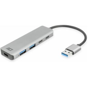 De ACT AC6125 USB-A hub voegt twee USB-A poorten en twee USB-C toe aan je laptop of computer. De hub is compatibel met de USB 3.2 Gen1 standaard, ook wel USB 3.0 genoemd, die als overdrachtssnelheid SuperSpeed USB 5Gbps levert. De ingebouwde USB-C poort is geschikt voor het leveren van extra voeding voor de aangesloten USB-A/USB-C apparaten die meer stroom nodig hebben. Voeg vier extra USB poorten toe aan je laptop De ACT AC6125 USB hub heeft een stevig aluminium ontwerp die door het lichte gewicht eenvoudig in je laptoptas past. De hub voegt vier extra USB poorten toe aan je laptop of computer voor het aansluiten van randapparatuur met een USB-A en USB-C connector. 5Gbps SuperSpeed USB 3.2 Gen1 (USB 3.0) De ACT AC6125 hub voldoet aan de USB 3.2 Gen1 standaard. Deze standaard heeft een overdrachtssnelheid van 5Gbps. De AC6125 4-poorts hub is te gebruiken met USB 3.0, USB 2.0 en USB 1.1. Optionele USB-C power poort De hub wordt gevoed wanneer deze is aangesloten op een laptop/computer en biedt genoeg stroom voor de aangesloten randapparatuur zoals een draadloze muis, toetsenbord, USB stick of SSD. De hub heeft een ingebouwde USB-C power poort voor het aansluiten van een optionele USB-C kabel en lader. Zo kunnen de aangesloten apparaten van stroom worden voorzien. Bijvoorbeeld wanneer je een 2,5” HDD wilt aansluiten. Gebruik een standaard USB lader en sluit een USB-C laadkabel aan op de USB-C poort van de hub. De lader en kabel worden niet meegeleverd.