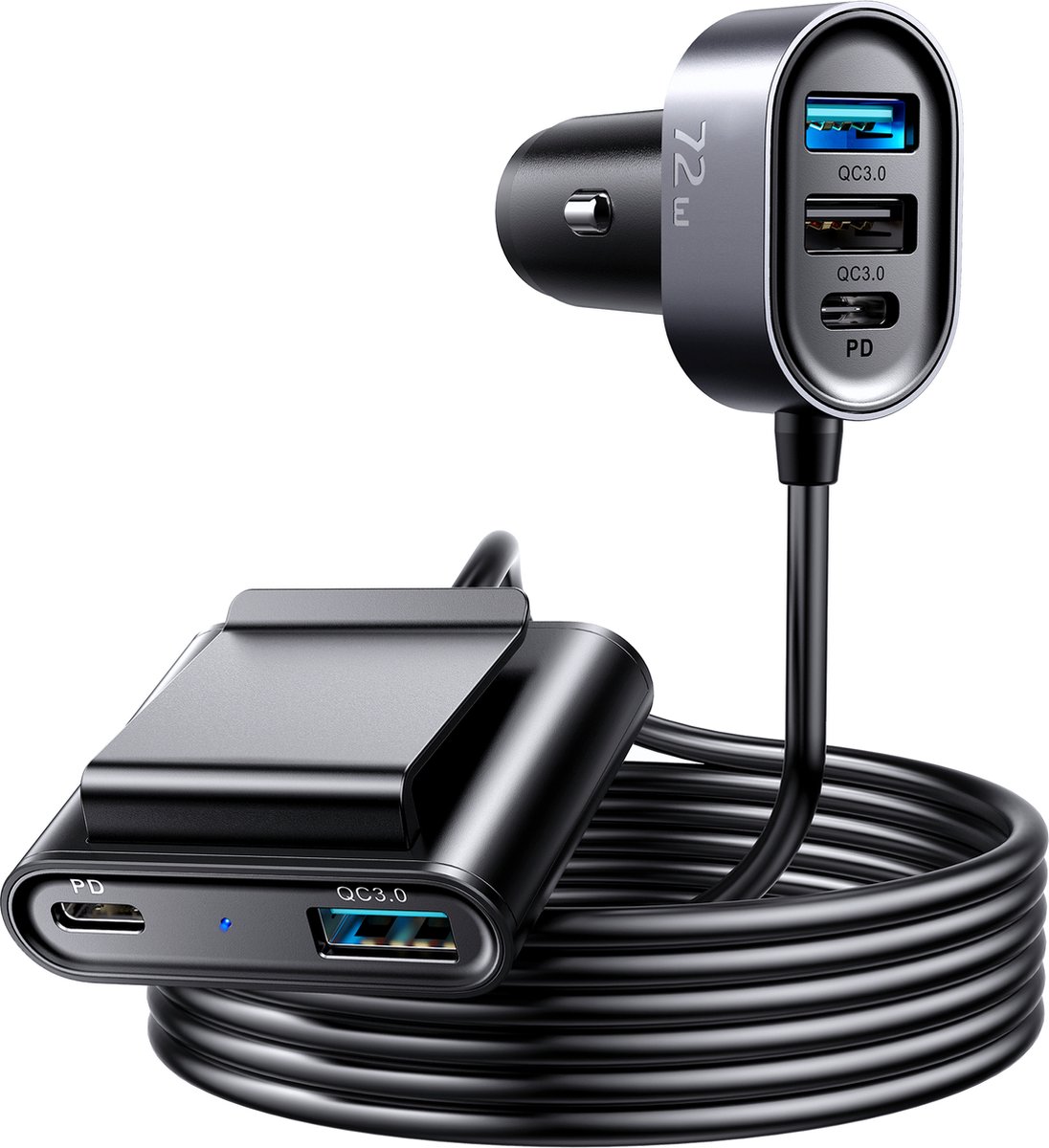 Joyroom autolader 2xPD + 2xQC3.0 72W 1.5m zwart (JR-CL05) Een autolader die snelle stroom levert aan elektronische apparaten is een accessoire dat de moeite waard is om mee te nemen op elke reis. Dit product stelt je in staat om tot wel 5 apparaten tegelijk op te laden en is bovendien uitgerust met een 1.5 meter verlengkabel, zodat elke passagier eenvoudig zijn apparatuur kan aansluiten. De lader levert een hoge uitgangsstroom... lees meer over dit product