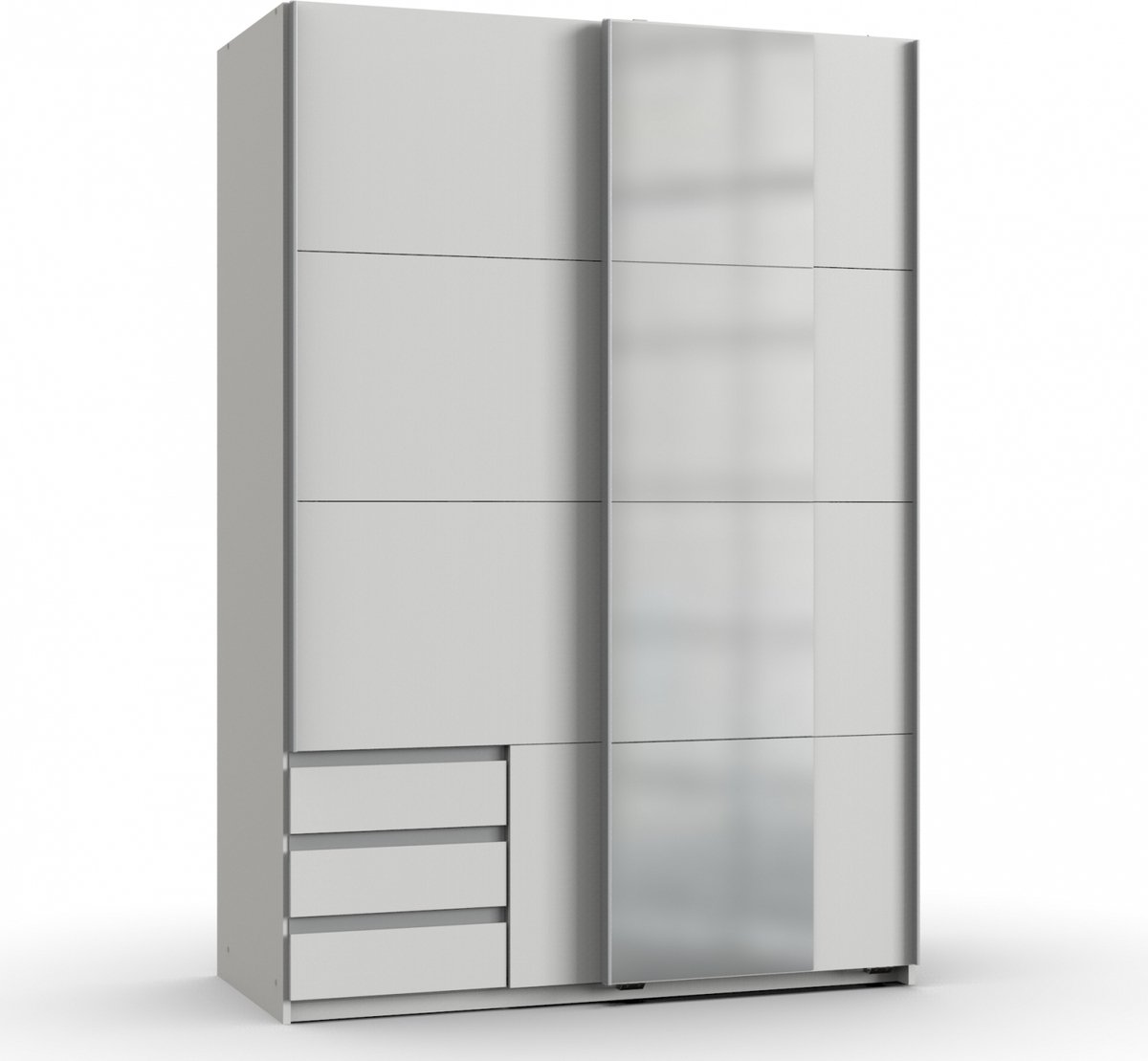 De schuifdeurkast Elsen heeft aan de linkerkant veel legplanken, waar je al je kleding kunt opbergen. Daaronder bevinden zich 3 laden voor kleine artikelen zoals ondergoed en sokken. Deze laden zijn handig te gebruiken vanaf de buitenkant van de kast. Aan de rechterkant van de kast is er een plank met daaronder een roede voor al je hangkleding.