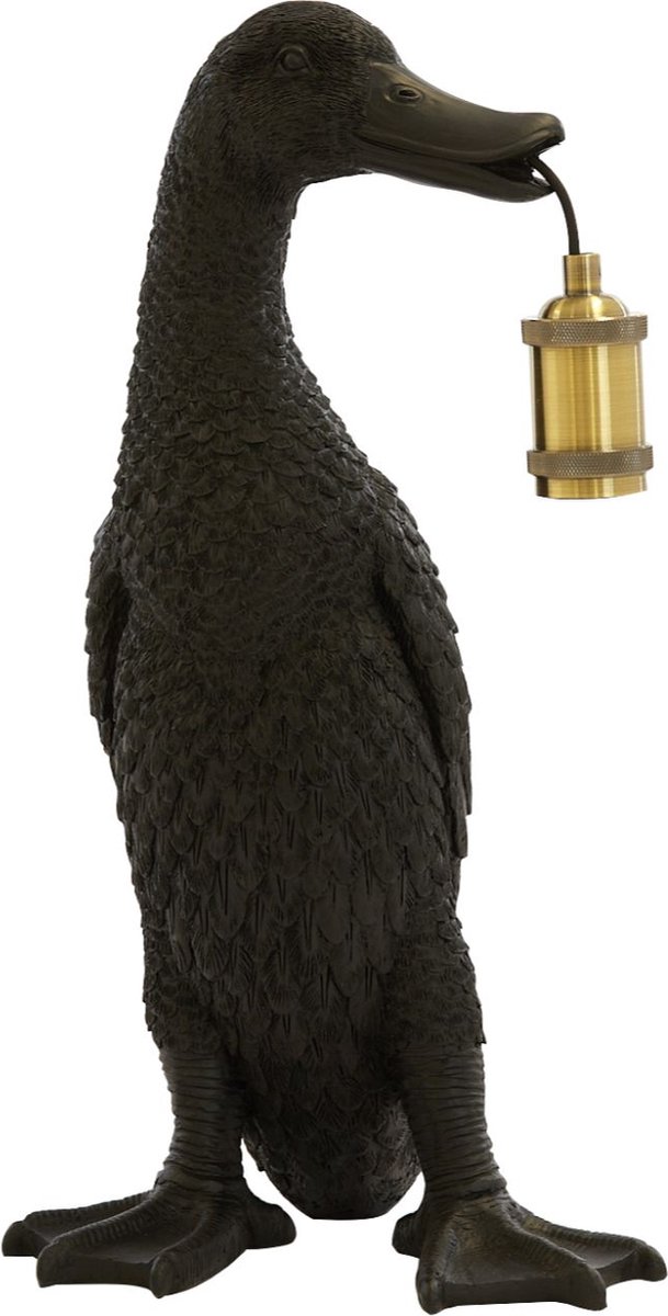 Elegante en speelse zwarte wandlamp in de vorm van een eend Verrijk uw bijzettafel met een vleugje speelse elegantie met de Duck tafellamp. Dit fascinerende stuk heeft een verrassend realistische eend-vormgeving met een luxueuze zwarte afwerking en meet 23,5x23x48,5cm. De speelse touch houdt daar niet op. De eend houdt op een slimme manier de lamp in zijn snavel, wat een vleugje plezier toevoegt aan het verfijnde ontwerp. Deze... lees meer over dit product