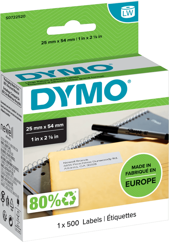 - Authentieke grote DYMO-adreslabels voor retouren bieden een duidelijke, leesbare tekst voor een correcte bezorging van pakketten