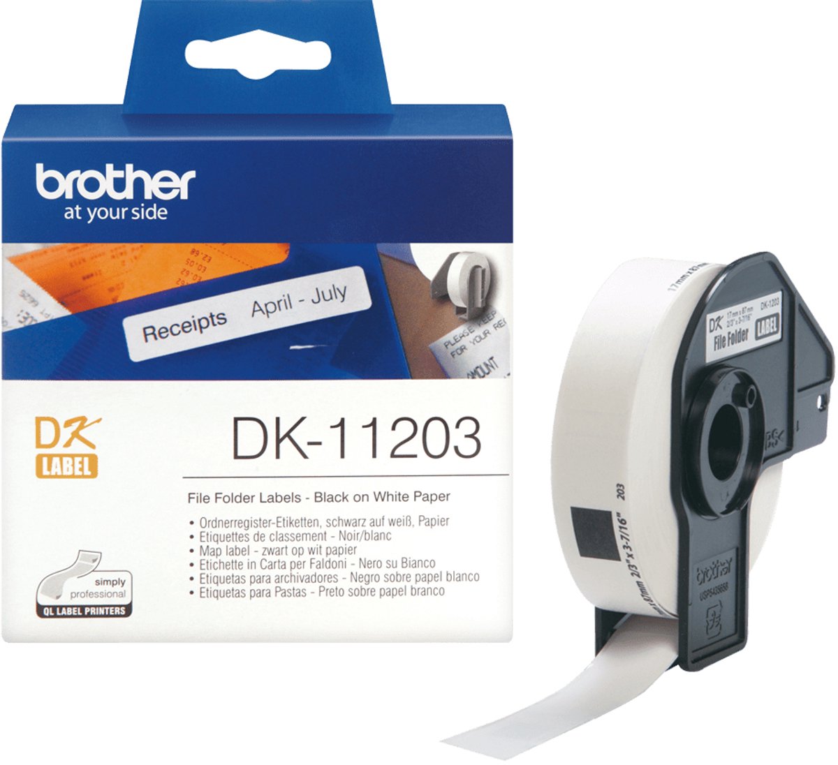 De DK-11203 map-/registeretiketten is een rol etiketten voor mappen en registers, waaraan ze zijn aangepast met een afmeting van 17x87 mm. Er zitten 300 witte zelfklevende etiketten op de rol. Het is geschikt voor P-Touch QL-560, QL-570, QL-580N, QL-650TD, QL-1050, QL-1060N.