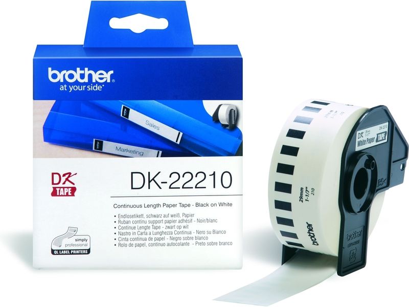 De witte doorlopende labelrol DK-22210 van Brother is een rol van ruim 30 meter lang en 29 mm breed. De DK-22210 is perfect voor het maken van labels voor mappen, enveloppen of schapaanduidingen. Het is eenvoudig om zelf labels van elk gewenste lengte op maat te creëren doordat je de labels zelf op de juiste lengte kunt afsnijden. De DK-22210 doorlopende labelrol heeft een sterke hechtlaag die zorgt voor permanente kleefkracht... lees meer over dit product