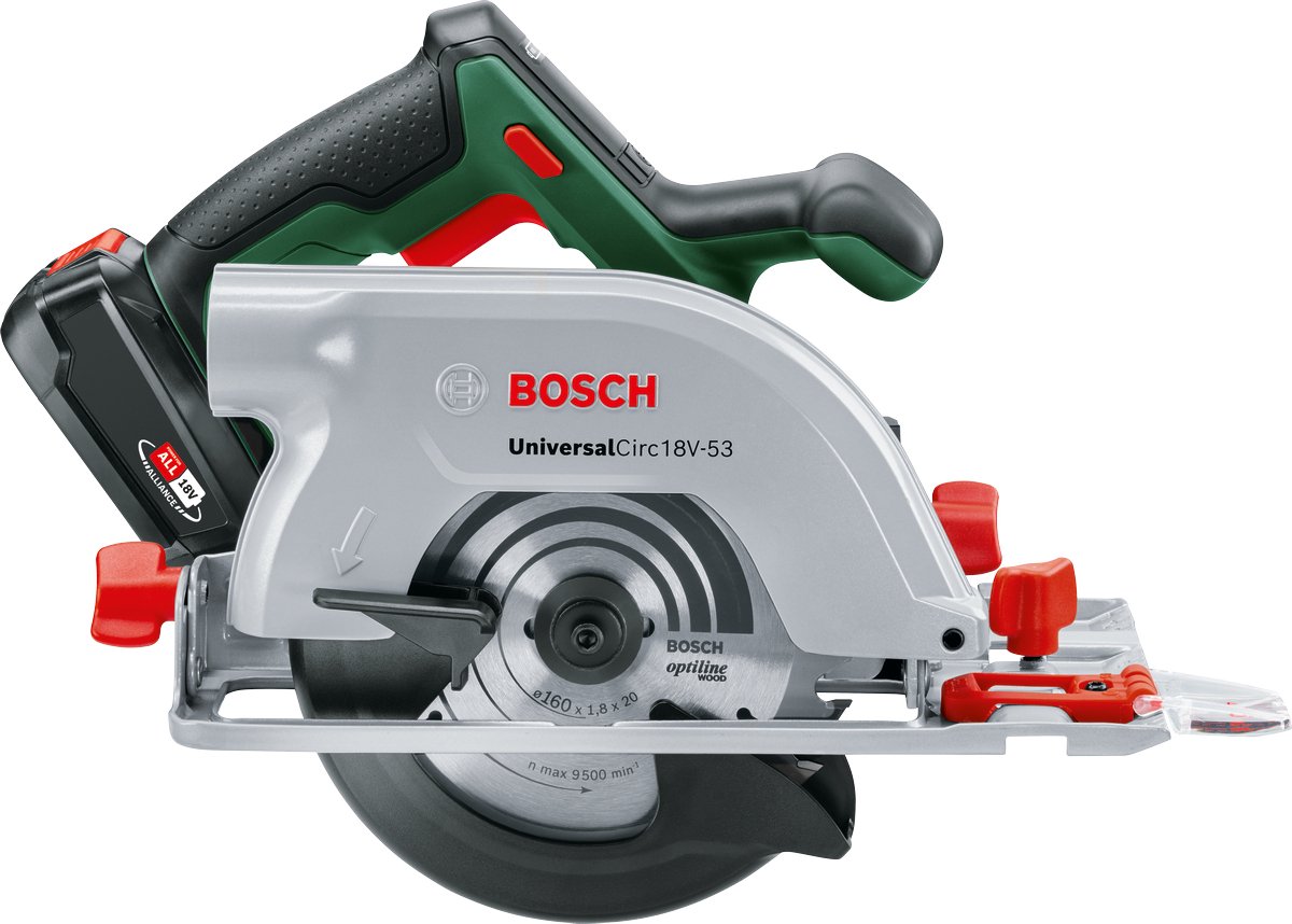 De UniversalCirc 18V-53 is de beste accucirkelzaag in zijn klasse voor een groot aantal houtbewerkingsklussen. Deze heeft een zaagdiepte van 53 mm voor nauwkeurig zagen van hout, spaanplaat en andere materialen op houtbasis. Een hoogwaardig zaagblad van 160 mm met 24 tanden met hardmetalen punten en een robuuste aluminium beschermkap aan de bovenkant garanderen nauwkeurig en krachtig zagen. Deze machine is compatibel met het Bosch Home & Garden geleiderailsysteem en garandeert zo optimale precisie, vooral voor lange zaagsneden.