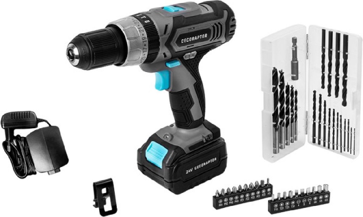 Hamerboormachine met 24 V 2.000 mAh accu, DC 775 motor, onbelast toerental 0-400/ 0-1.550 tpm, slagfrequentie 0-6.000 / 0-22.500 bpm, max. koppel 50 Nm met 25+1+1 draaimomentstanden en 2 snelheden, automatische snelspanboorhouder 2-13 mm, werklamp, accuduur tot 30 min. Inclusief set van 20 bits en 20 boren. Accu hamerboormachine met oplaadbare 24 V, 2.000 mAh lithium-ion accu.