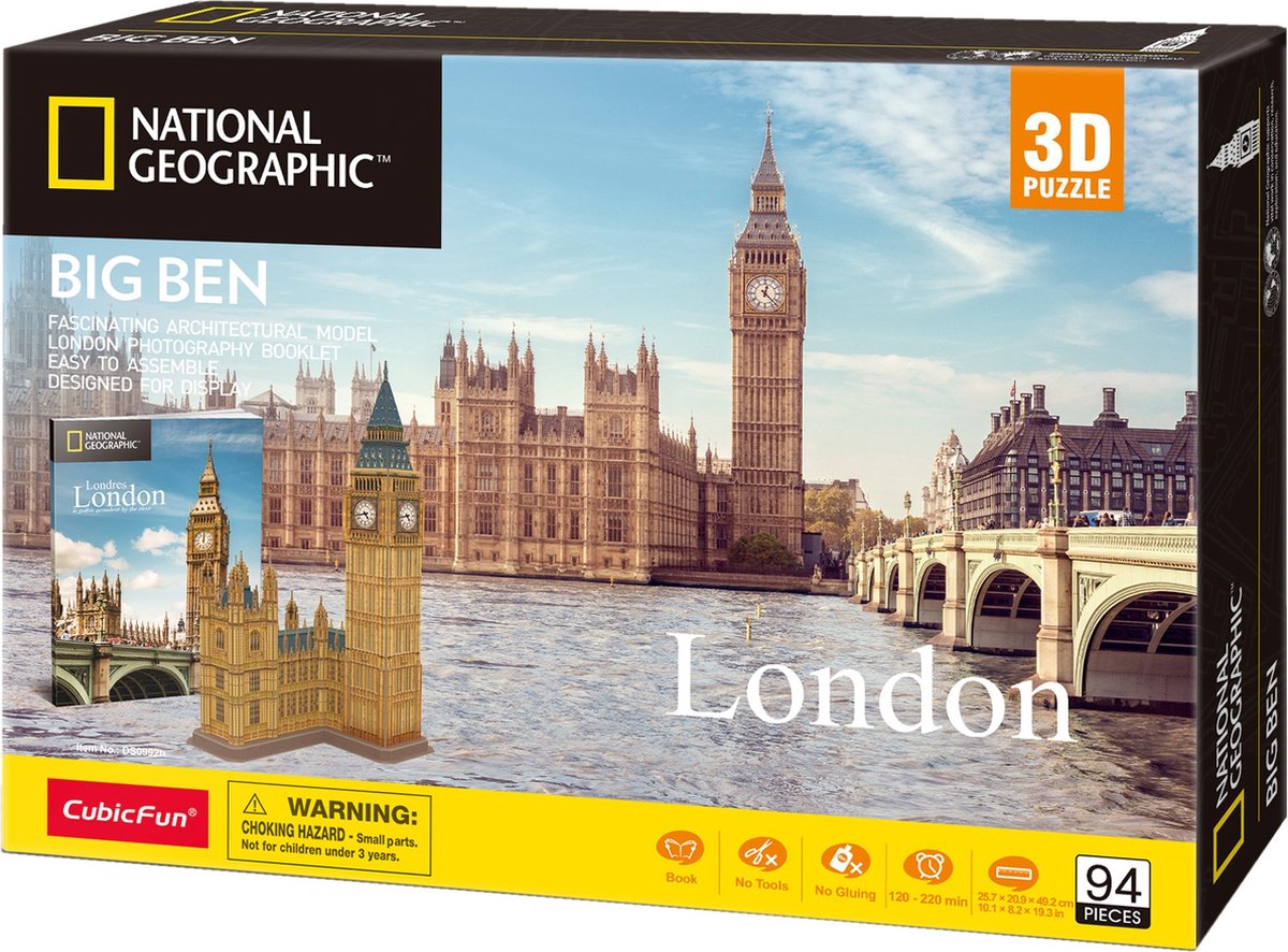 Met deze National Geographic 3D-puzzel van de Big Ben haal je een stukje Londen in huis. Een perfect verzamelobject voor puzzelliefhebbers en een unieke manier om het iconische monument te bewonderen vanuit het comfort van je eigen ruimte.