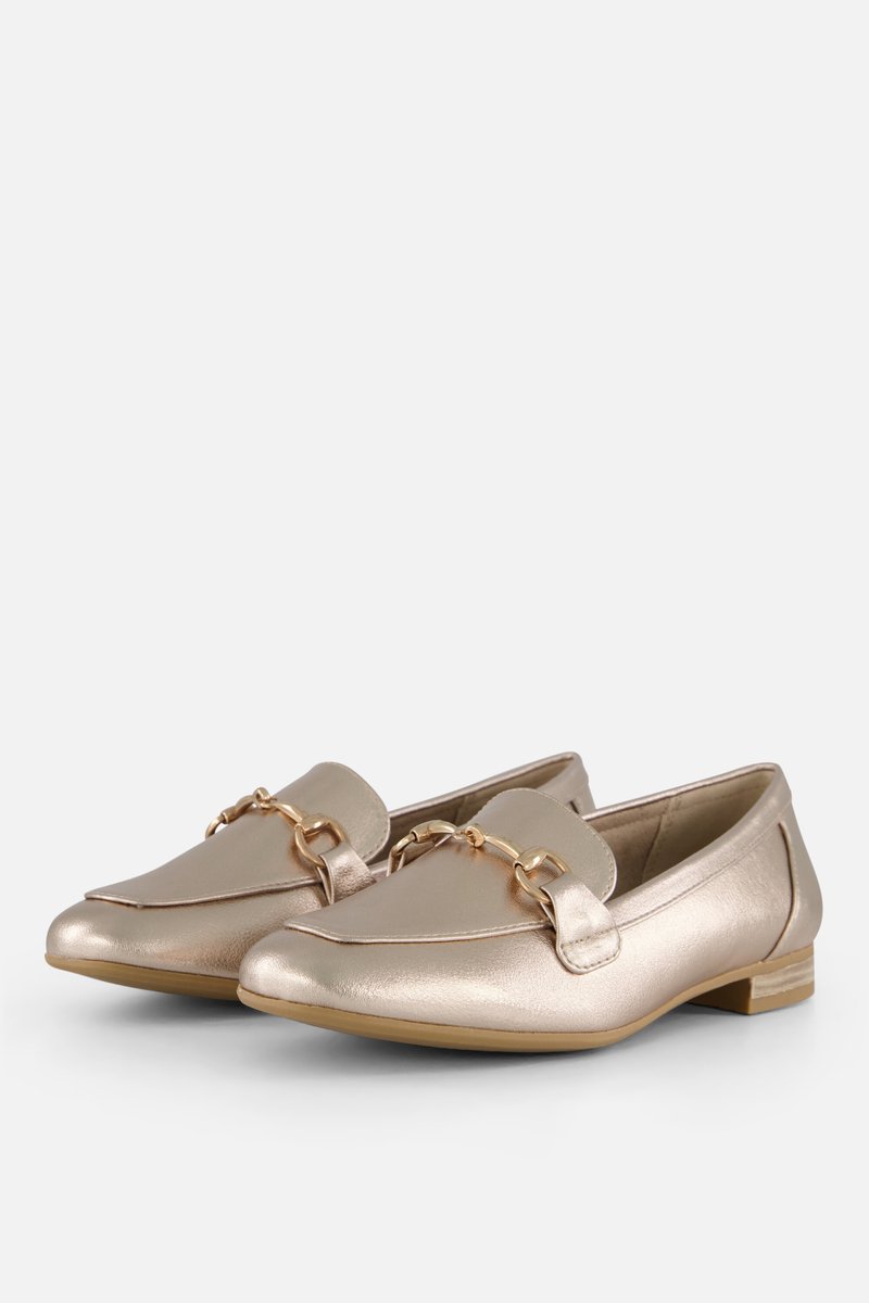 Deze opvallende metallic Marco Tozzi instappers zijn volledig gemaakt van textiel en synthetisch materiaal. Voorzien van een goudkleurige decoratie gesp. De instappers zijn vegan en hebben een vast voetbed.