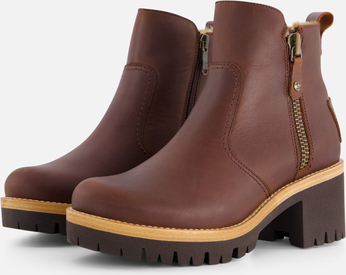 Deze gevoerde Panama Jack Pauline B9 enkellaarsjes zijn gemaakt van nappaleer. De voering en anatomische binnenzool zijn van imitatiebont. De zool is gemaakt van duurzaam en flexibel rubber met een hakhoogte van 6,5 centimeter.