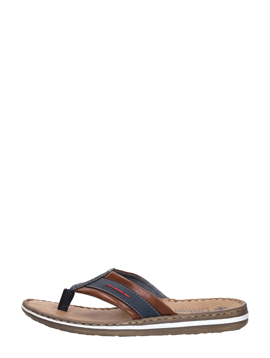 Blauw-cognackleurige teenslippers van het merk Rieker. De slippers zijn gemaakt van een combinatie van leer en textiel. De kleurcombinatie en de stiksels geven de slippers een stoere uitstraling. Rieker wil dat je het idee geven dat je op wolkjes loopt. Met deze teenslipperse zal je dus zeer comfortabel de zomer door komen. lees meer over dit product