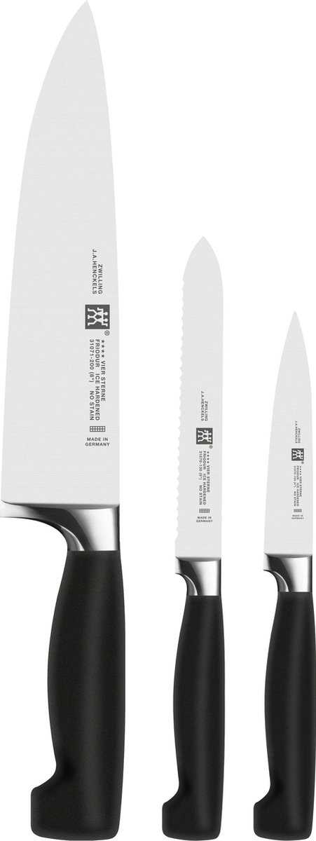 De Four Star serie behoort tot de meest populaire gesmede keukenmessen in de wereld. De lijn bestaat al sinds 1976 en is nog altijd actueel en zeer uitgebreid. Four Star messen hebben het Friodur kenmerk, dit houd in dat ze tijdens een speciaal ijshardingsproces hoogwaardig worden veredeld. Zij zijn hierdoor buitengewoon scherp, corrosiebestendig en flexibel.Het lemmet loopt met een krop over naar de handgrepen. De krop zorgt voor de juiste balans, werkt als een vingerbescherming en voorkomt dat u van de greep naar het lemmet afglijdt.De naadloze handgrepen zijn gemaakt van een buitengewoon hoge kwaliteit kunststof met een ergonomisch verantwoorde greep. De snede is lasergecontroleerd en vlijmscherp.Deze drie delige messenset bestaat uit een koksmes (20cm),een universeelmes (13cm) en een schil- garneermes (10cm)Het Duitse merk Zwilling bestaat al sinds 1731 en maken hoge kwaliteitsmessen die over de hele wereld worden verkocht. Zwilling Heckels messen worden tijdens de fabricage hard gemaakt door de spanningen uit het staal te halen en zo ook de structuur te verbeteren. Hierdoor worden deze Zwilling messen meer bestand tegen roest. Dit merk maakt messen die lekker in de hand liggen, voor in messenblokken maar ook voor alleen messensets.