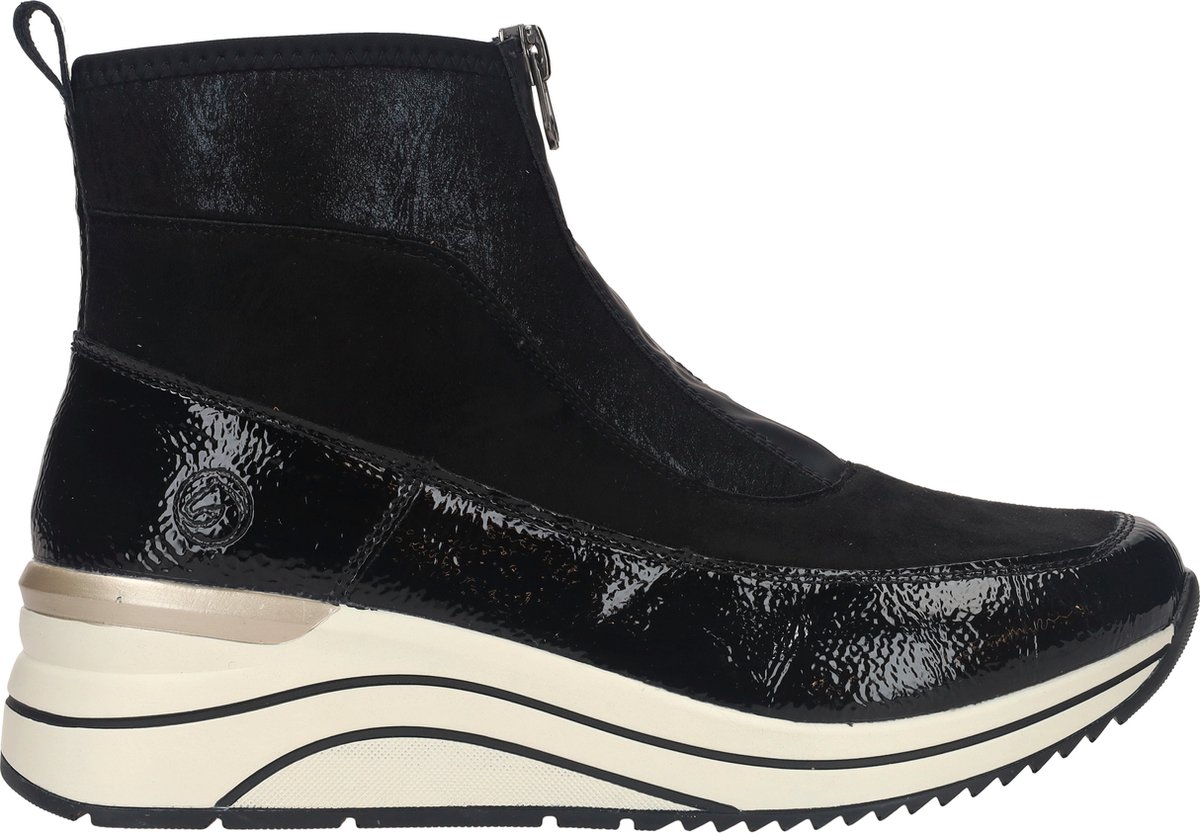Halfhoge Remonte sneakers voor dames in het zwart. De sneaker heeft een mooie zwarte lak rand en een trendy witte hoge zool.