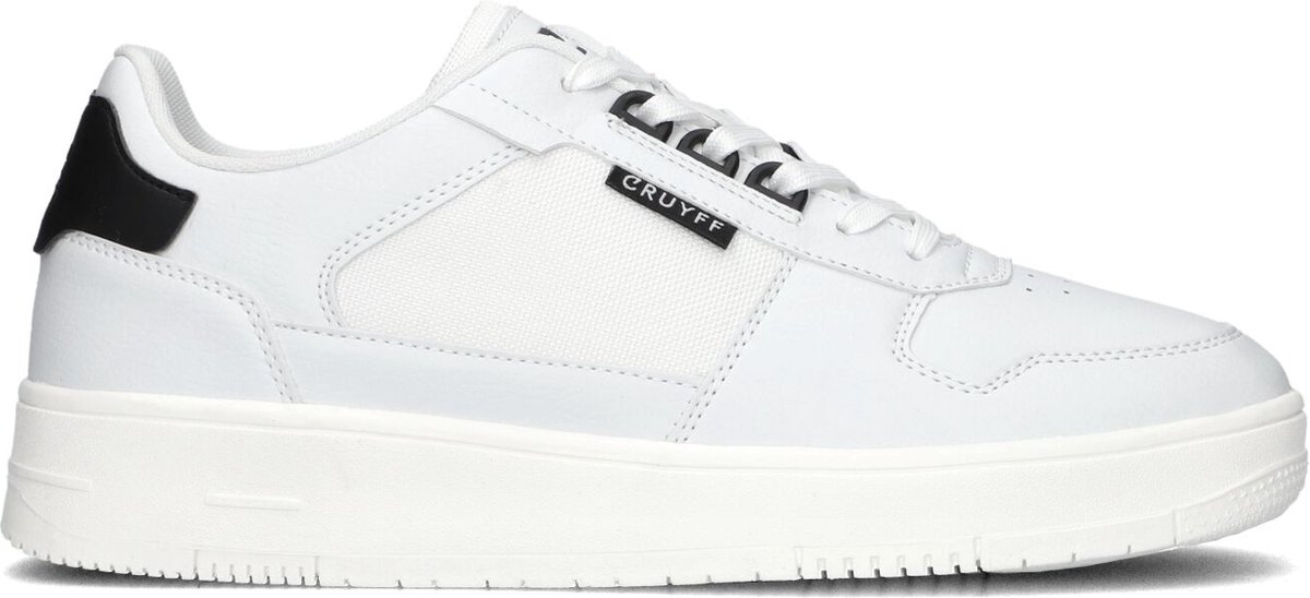 Stap in stijl met de CRUYFF INDOOR KING lage sneakers voor heren. Deze witte sneakers zijn gemaakt van wit leatherlook in combinatie met wit mesh textiel. De binnenvoering is gemaakt van textiel en heeft een uitneembaar voetbed. Opvallend zijn de zwarte veterringen, de perforaties op de neus en de merkemblemen die terug zijn te vinden op de zijkant, hiel en tong. De rubberenzool met gripvast profiel biedt ultiem loopcomfort. Laat je stijl zien met deze trendy sneakers van CRUYFF.