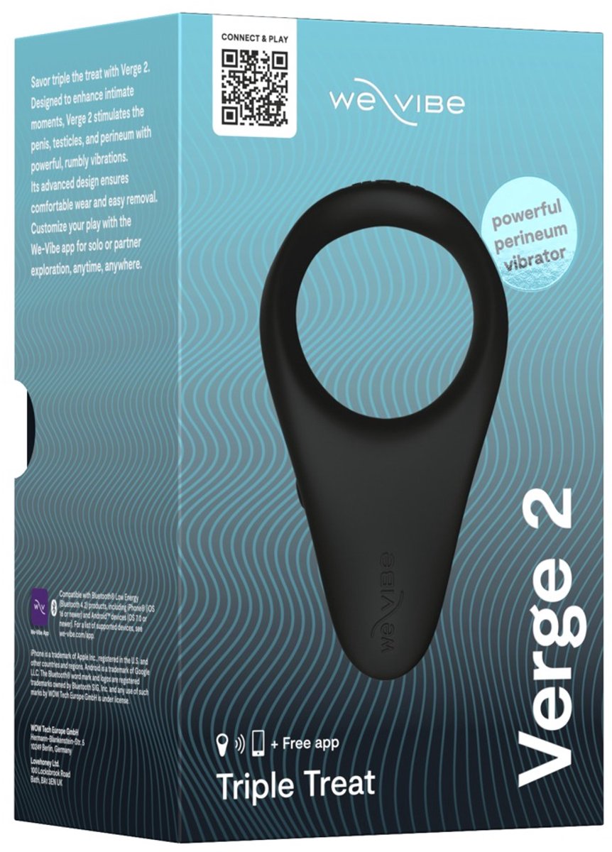 Deep Vibes hoch 3! De Verge 2 van We-Vibe stimuleert met krachtige diepe vibraties de penis, de testikels en het gevoelige perineum. De aangenaam stevige pasvorm van de rekbare ring intensiveert bovendien het 3-voudige genot. Perfect voor intensief solo en plezier met z'n tweeën! Gemaakt van zacht siliconen en ideaal gevormd, sluit hij perfect aan en beweegt hij mee met elke beweging. Verwennen met 10 fluisterstille vibratiestanden gemakkelijk met een druk op de knop direct op het speeltje. Ook in bad en douche, want de Verge 2 is waterdicht. Met de We-Vibe App op de smartphone zijn extra functies beschikbaar zoals afstandsbediening, individueel aanpasbare vibratiepatronen, Touch Mode, het creëren van eigen programma's, evenals afstandsspellen en het delen van de bediening met een partner. Oplaadbaar – inclusief USB-oplaadkabel. Totale lengte 11,4 cm; Ring binnen: 5,3 cm x 4,5 cm. Siliconen.