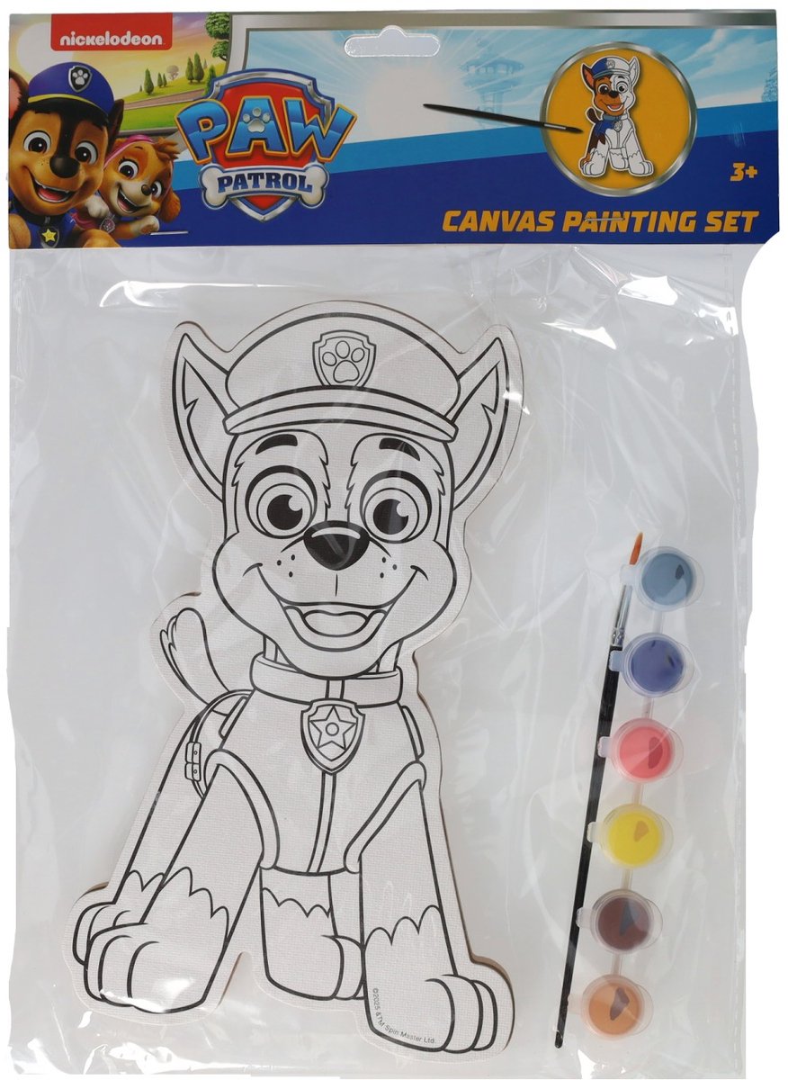 Schildercanvas in de vorm van Chase uit PAW Patrol, met zes kleuren verf en een penseel. Geschikt vanaf 3 jaar. lees meer over dit product