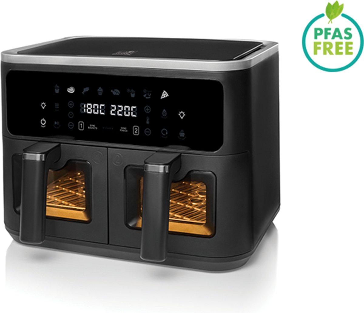 - ‘SYNC finish’ toets: Synchroniseert de kooktijden van beide korven zodat beide gerechten op hetzelfde ogenblik klaar zijn