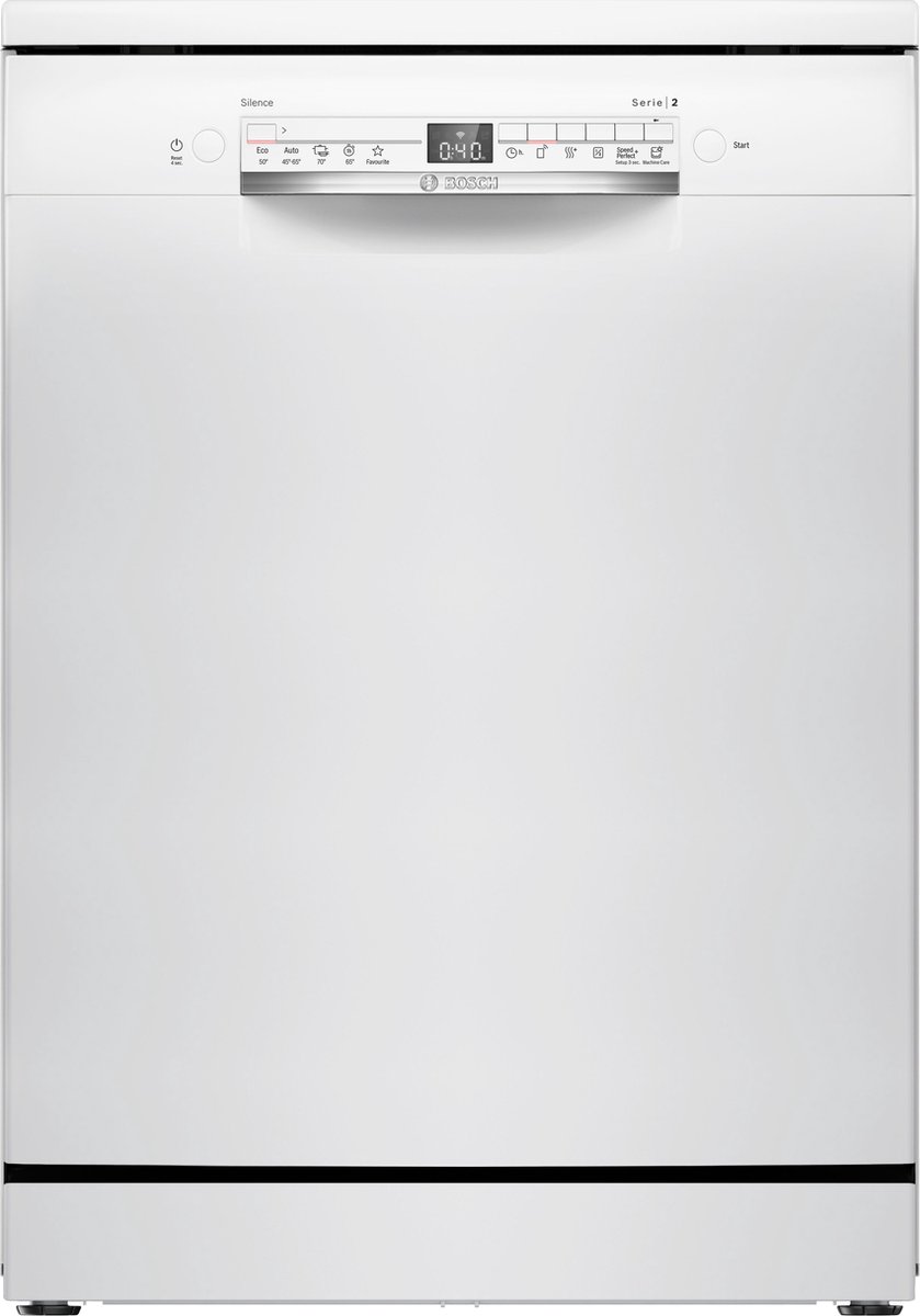 De Bosch SMS2HTW02E Serie 2 is een vrijstaande vaatwasser van 60 cm breed in de kleur wit. DEze vrijstaande vaatwasser met Energielabel D beschikt over Home Connect om op ieder moment de mogelijkheid om het geluid te reduceren via de Home Connect App.