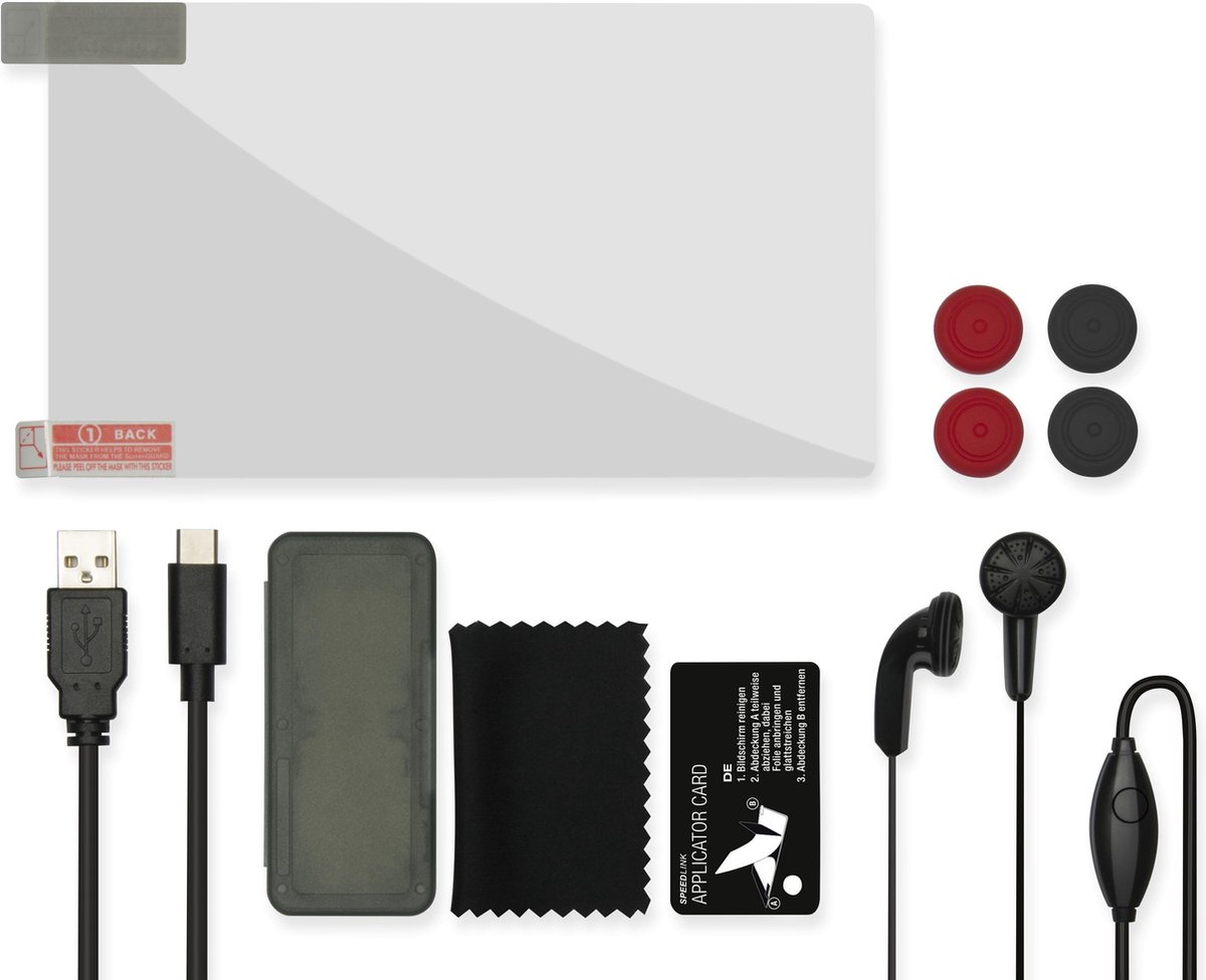 Het volledige accessoirepakket voor uw Nintendo-Switch-console: In het STARTER PACK 7-IN-1 zitten een praktische oplaadkabel voor gelijktijdig opladen en gamen, een transparante beschermfolie, een In-Ear-hoofdtelefoon voor een helder stereogeluid en nog veel meer. Zo staat het STARTER PACK garant voor optimale bescherming en comfort voor console en games zowel thuis als buiten de deur. Kenmerken: - Zevendelig accessoirepakket coor de Nintendo-Switch-console. - Optimale bescherming en maximaal comfort voor console en games. - Oplaadkabel voor elke USB-aansluiting (3m). - Beschermfolie voor het beeldscherm met bevestigingshulp. - Hoogwaardige reinigingsdoek voor het beeldscherm. - Slipvrije siliconen opzetstukken voor de analoogsticks (2 sets, rood en zwart). - Sterke hoes voor max. vier gameskaarten. - In-ear-headset met jackplug van 3,5mm en microfoon voor een optimale stereoklank, ook onderweg.