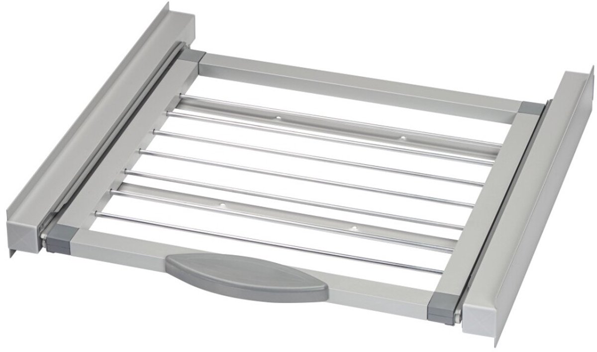 - Universeel tussenframe voor veilige bevestiging van de droger op de wasmachine- Universeel, compatibel met de meeste wasmachines en wasdrogers met een werkblad van 60 x 60 cm- Geïntegreerd uittrekbaar wasrek (max. 12 kg was) voor het ophangen van kleinere items op een comfortabele werkhoogte of als handige opslagplaats voor de wasmand- Praktische greep aan het wasrek voor eenvoudigere bediening- Met veiligheidssjorband: omlaag kiepen van de droger, bijvoorbeeld door trekbelastingen aan de deur, wordt verhinderd- Snel en eenvoudig zonder schroeven te installeren, want volledig gemonteerd
