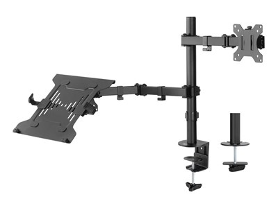 De AC8305 Monitor Bureausteun met laptoparm creëert een ergonomische en plaats besparende werkplek. Bevestig de monitorsteun op of door een bureau (max. tafeldikte 88mm). Plaats eenvoudig een scherm tot 32” en 8kg op de AC8305 met het beeldschermmontagesysteem. De arm met daaraan de laptopsteun is geschikt voor een laptop tot 15,6” en 4kg. De steun heeft drie knikpunten voor het instellen van de ideale kijkafstand. De monitor en de laptop zijn op de gewenste kijkhoek te plaatsen door deze te kantelen, te roteren of te zwenken. De kabels kunnen worden weggewerkt met het kabelmanagementsysteem. Creëer een ergonomische werkplek De AC8305 monitor bureausteun is in hoogte verstelbaar en heeft drie knikpunten. Door het scherm en de laptop te kantelen, roteren of te zwenken creëer je de meest ergonomische werkhouding waardoor de kans op nek-, rug- en schouderklachten worden verkleint. Kabels zijn netjes weg te werken dankzij het handige kabelmanagementsysteem. Handig beeldschermmontagesysteem Het handige beeldschermmontagesysteem maakt het mogelijk om zelf de monitor op de bureausteun te plaatsen. De steun heeft VESA 75x75 en 100x100. De AC8305 wordt compleet geleverd met alle montagemiddelen voor zowel klem- alsook doorvoermontage. De bureausteun is geschikt voor tafels met een maximale dikte van 88mm. Laptophouder met open ontwerp voor een maximale luchtstroom De AC8305 is geschikt voor laptops tot 15,6” en 4kg. De laptopsteun heeft een verstelbare klem en veiligheidslijst voor het op de plek houden van de laptop. Het open ontwerp heeft een maximale luchtstroom die zorgt voor een betere warmtegeleiding.