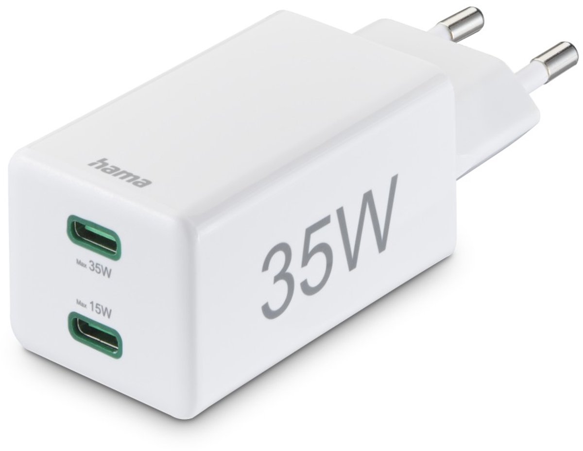 De Hama 35W mini snellader biedt snelle oplaadtijden via 2× USB-C met PD en QC. Perfect voor smartphone, tablet of earbuds tegelijk. Compact en licht, ideaal voor dagelijks gebruik of reizen. Betrouwbare Hama-veiligheid voorkomt oververhitting.- 35W totaalvermogen