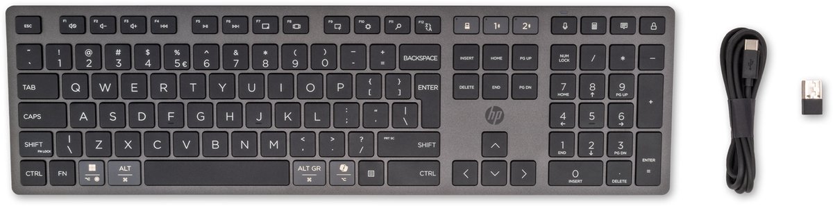 Werk vol vertrouwen met apparatuur die je altijd en overal productief houdt. Dit praktisch ontworpen draadloze toetsenbord voor meerdere apparaten werkt supersnel dankzij de supercondensator-oplaadtechnologie, naadloze connectiviteit en aanpassingsmogelijkheden. Klaar wanneer jij dat bent Vervang nooit meer batterijen en werk zorgeloos met een ultrasnelle oplaadbare supercondensator die tot 2 maanden meegaat na 3 minuten opladen. Je kunt het toetsenbord zelfs tijdens het werk opladen met de meegeleverde USB-C-kabel en ononderbroken doorgaan met typen. Schakel moeiteloos tussen apparaten Maak naadloos en veilig verbinding met meerdere besturingssystemen en apparaten: twee via Bluetooth en één via de 2,4 GHz HP Unifying Dongle. Met de toets Multi-device op dit toetsenbord schakel je ook eenvoudig tussen aangesloten randapparaten van de ene pc naar de andere. Productiviteit die bij je past Verhoog je productiviteit met programmeerbare toetsen die onnodige toetsaanslagen verminderen. Met één druk op de knop heb je ook toegang tot Microsoft Copilot om slimmer en efficiënter te werken. Ontworpen voor een betere toekomst Het HP Multi-Device Rechargeable Wireless Keyboard bevat ten minste 60% PCR-materiaal. En door voor dit toetsenbord te kiezen, kun je helpen voorkomen dat er in de komende vier jaar wereldwijd meer dan 150.000 batterijen bij het restafval belanden.