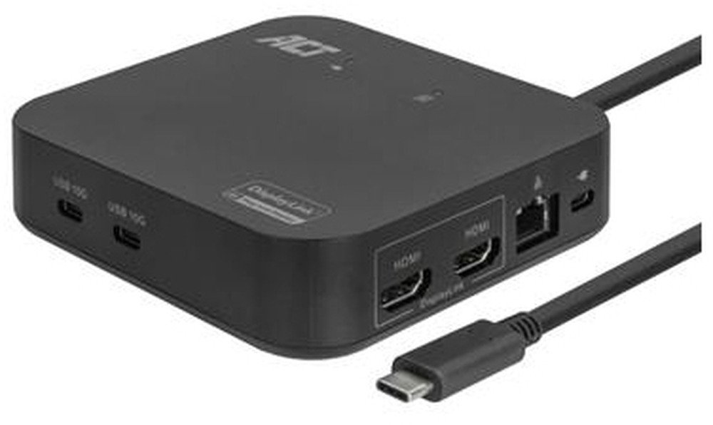 Het AC7150 USB-C dockingstation verandert je Windows laptop of MacBook in een compleet werkstation door één enkele USB-C kabel aan te sluiten. Met de ingebouwde DisplayLink-technologie kan je tot twee extra 4K-schermen aansluiten voor een uitgebreide monitorweergave op zowel Windows- als Apple-computers. Het dockingstation is uitgerust met een Gigabit LAN-poort, twee USB-C-poorten, vier USB-A-poorten, een headset-poort en een beveiligingssleuf. De AC7150 wordt via USB gevoed via de bijgevoegde USB-C kabel. Sluit de USB-C oplader van je laptop aan op de Power Delivery doorvoerpoort om je laptop op te laden. Het ACT USB-C 4K Docking Station voldoet aan alle eisen van het DisplayLink Certified Logo Program. De AC7150 is een compact dockingstation voor werk en reizen met een vaste USB-C kabel van 1 meter. Twee extra 4K-schermen en je laptopscherm breiden je werkruimte uit tot een totaal van drie schermen. De AC7150 kan ook worden gebruikt met USB-A laptops met behulp van de meegeleverde USB-C naar USB-A adapter. Je kunt nog steeds je beeldschermen uitbreiden en de meeste andere functies gebruiken. Mogelijk moeten er stuurprogramma's worden geïnstalleerd als het docking station wordt aangesloten op oudere laptops via de USB-A-poort. De stroomvoorziening via de USB-C poort blijft werken. De gegevensoverdrachtsnelheid van de USB-C poort zal echter beperkt zijn tot de snelheid van de USB-poort van de laptop.