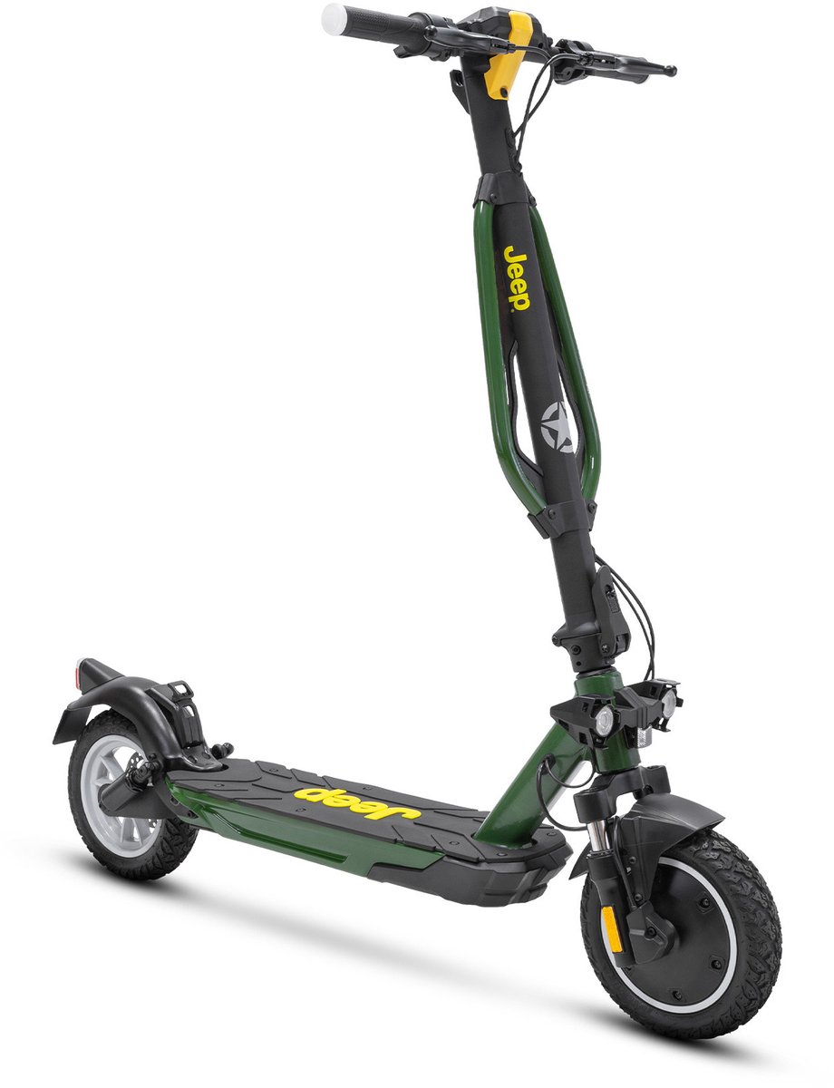 Jeep JEEJADAS. Soort: Klassieke step, Kleur van het product: Zwart, Groen, Geel, Maximum snelheid: 20 km/h. Batterijtechnologie: Lithium-Ion (Li-Ion),Motor vermogen: 400 W, Accu/Batterij voltage: 36 V. Breedte: 555 mm, Diepte: 1185 mm, Hoogte: 1170 mm. Batterijcapaciteit: 374,4 Wh. Diepte verpakking: 1230 mm, Hoogte verpakking: 535 mm, Gewicht verpakking: 21,9 kg