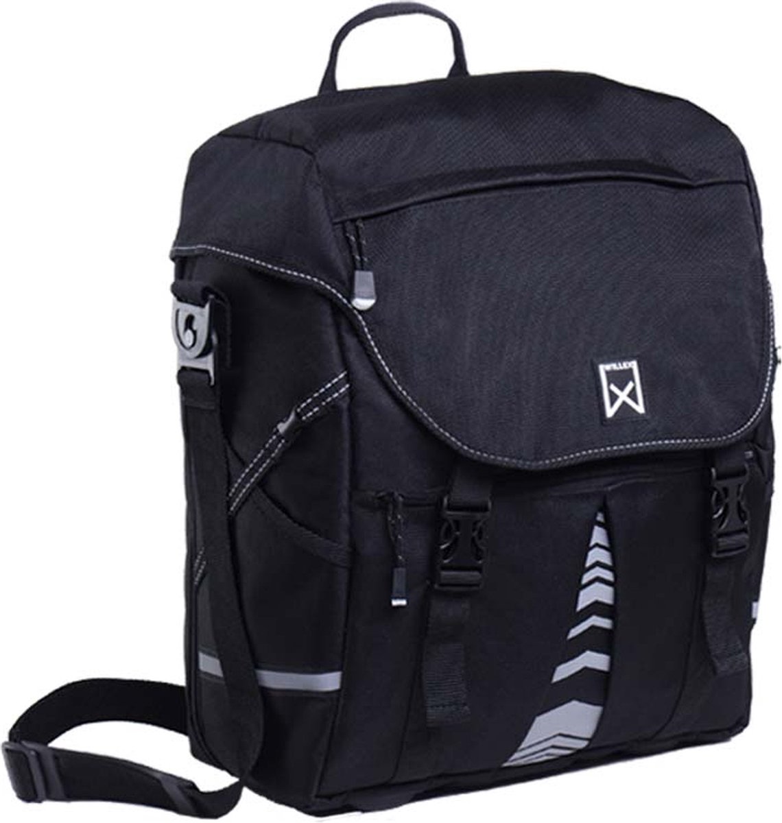 Ruime enkele tas met afneembare en verstelbare schouderband. Waterdicht en waterafstotend polyester. Extra ritsvak vóór. Met binnenvak en handig haakje voor sleutelbos etc. aan beide zijden. Met reflecterende bies. Opvallende reflecterende bedrukking. Gepatenteerde Willex® klemhaken voor stabiele bevestiging op bagagedrager. Gepatenteerde Willex® vergrendeling voor stabiele bevestiging op bagagedrager. Inclusief gratis grote regenhoes met Willex® reflectie. Inhoud: 14 liter.