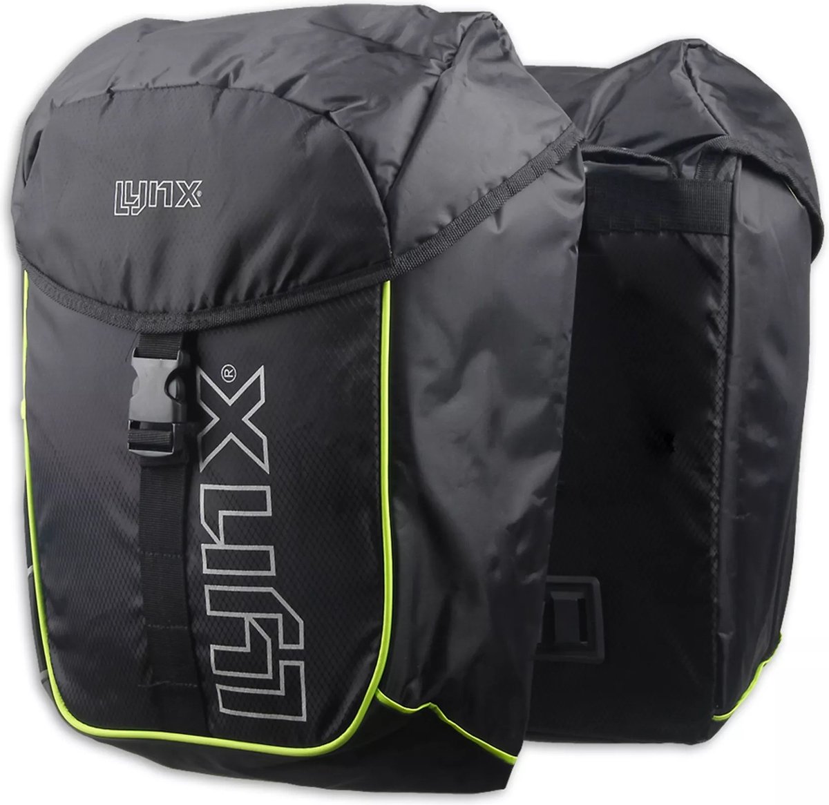 De dubbele fietstas model Lake van het merk Lynx, is een compacte en sportieve tas voor dames- en herenfiets. Met een inhoud van 31 liter is de tas uitermate geschikt voor het doen van boodschappen of een lange fietsrit. Verder zijn er aan de zijkanten twee elastische vakken aangebracht, waarin je o.a. een drinkfles kunt bewaren. De tas is gemaakt van waterafstotend polyester-ripstop en wordt standaard geleverd met een waterdichte regenhoes. De fietstas is gemakkelijk aan ieder type drager te bevestigen (ook e-bike) middels de riempjes. Het binnenvak van iedere tas is afzonderlijk af te sluiten met een trekkoordsluiting, waar de gespsluiting van het hoofdvak overheen valt. Voor extra zichtbaarheid zijn er reflecterende elementen aangebracht op de dubbele fietstas.