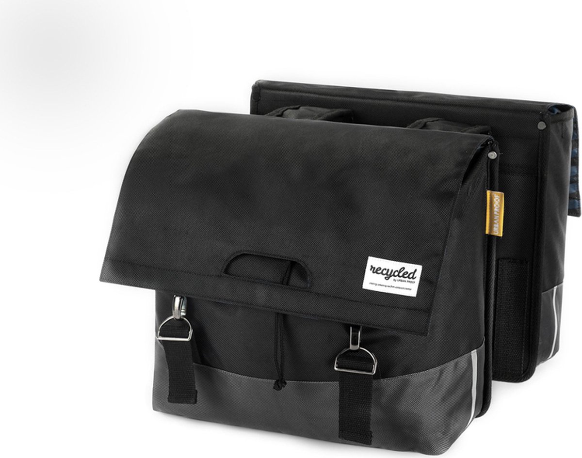 Urban Proof 2 x 27,5 Liter dubbele fietstas is een sterke tas met een verstevigde rug en bodem, gemaakt van gerecycled PET materiaal (RPET). De tas heeft twee ruime opbergvakken met een totale inhoud van 2 x 27,5 Liter. Hij is zo gemaakt dat je snel en eenvoudig de tas kan openen en sluiten met de chromen haken. De tas is gemaakt van waterafstotend RPET en heeft aan de binnenkant een waterbestendige voering als extra bescherming voor jouw spullen. Met de daarvoor bestemde riempjes is de dubbele fietstas eenvoudig aan jouw bagagedrager te bevestigen.