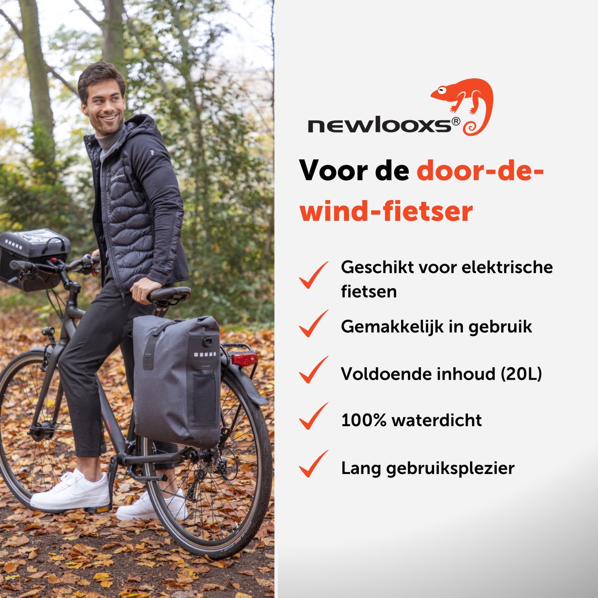 De meeste fietstassen van New Looxs worden gemaakt van waterdicht polyester. Maar verliezen de 100% waterdicht garantie door de manier waarop ze gestikt zijn. Het materiaal kan waterdicht zijn, maar via de naden kan het water alsnog de tas in komen. Om dit te voorkomen hebben wij een tas gemaakt zonder naden en heeft het een rolstop sluiting met een gesp.