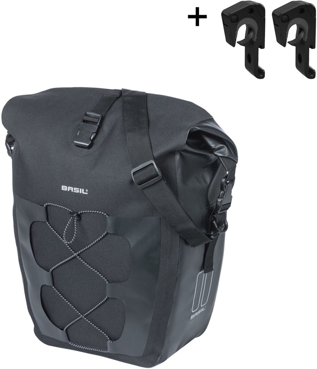 De Basil Navigator Waterproof L met MIK Hooks is een enkele fietstas voor achterop een dames- of herenfiets. De sportieve zwarte tas heeft een inhoud van 25 tot 31 liter.Waterdicht en sterkLeg je sportieve lat hoger met de Basil Navigator Waterproof L. 100% waterdicht (IPX 3) en een inhoud van 25 tot 31 liter maken de enkele fietstas ideaal om mee op pad te gaan. De tas is gemaakt van een combinatie van taurpaulin en 600D poly... lees meer over dit product