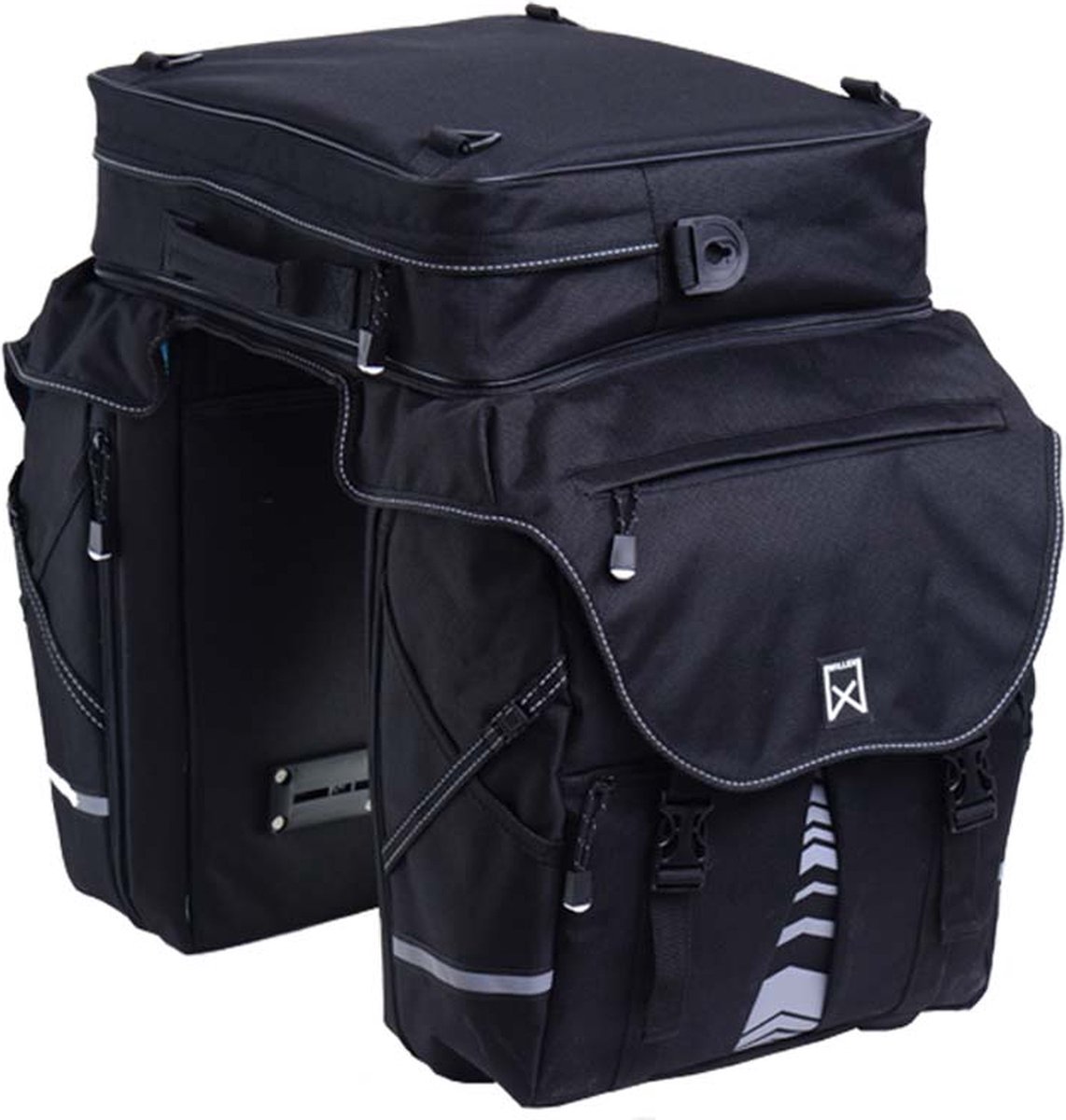 Compacte dubbele tas, aan beide zijden vergrootbaar met extra rits. Degelijke tas met drie grote compartimenten. Bovenvak is afneembaar. Waterdicht en waterafstotend polyester. Met binnenvak en handig haakje voor sleutelbos etc. aan beide zijden. Met reflecterende bies. Opvallende reflecterende bedrukking. Gepatenteerde Willex® klemhaken voor stabiele bevestiging op bagagedrager. Inclusief gratis grote regenhoes met Willex® reflectie. Inhoud: 65 liter.