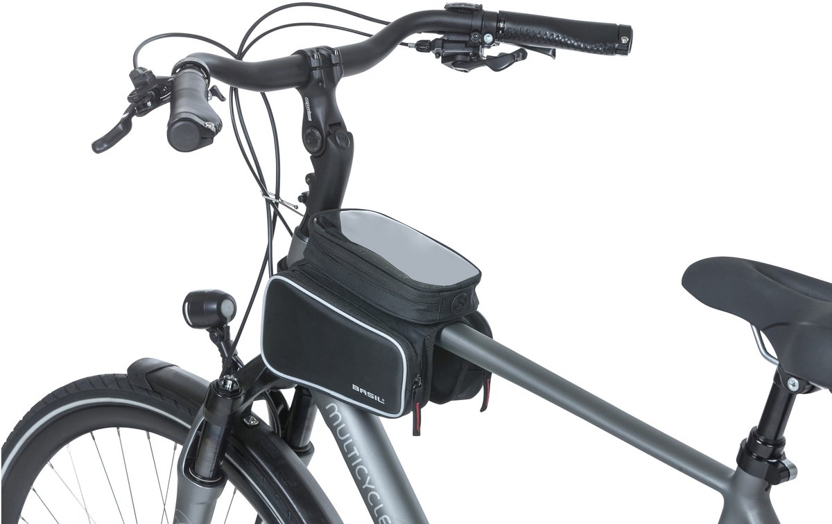 De Basil Sport Design top tube frametas is perfect voor het maken van een recreatieve fietsricht. De sportieve zwarte tas heeft namelijk diverse handige features. Met een inhoud van 1,5 liter neem je kleine accessoires zoals je mobiel, sleutels of een bandenplaksetje mee. De tas bevestig je eenvoudig op de stang van je fiets door middel van klittenband. De tas kenmerkt zich door een sportief design en is gemaakt van waterafstotend polyester. De twee zijcompartimenten beschikken elk over een eigen binnenvak. Verder heeft de frametas een afneembaar boventasje waar plek is voor je smartphone. Je telefoon is gemakkelijk te bedienen dankzij een touchable venster en is er een opening aanwezig voor je oordopjes. Het reflectiemateriaal op de frametas maakt je beter zichtbaar in het donker, zodat je beter opvalt in het verkeer. Eigenschappen Voorzien van afneembaar boventasje met touchable venster voor je mobiel Twee zijvakken met een eigen binnenvak Eenvoudige bevestiging door middel van klittenband