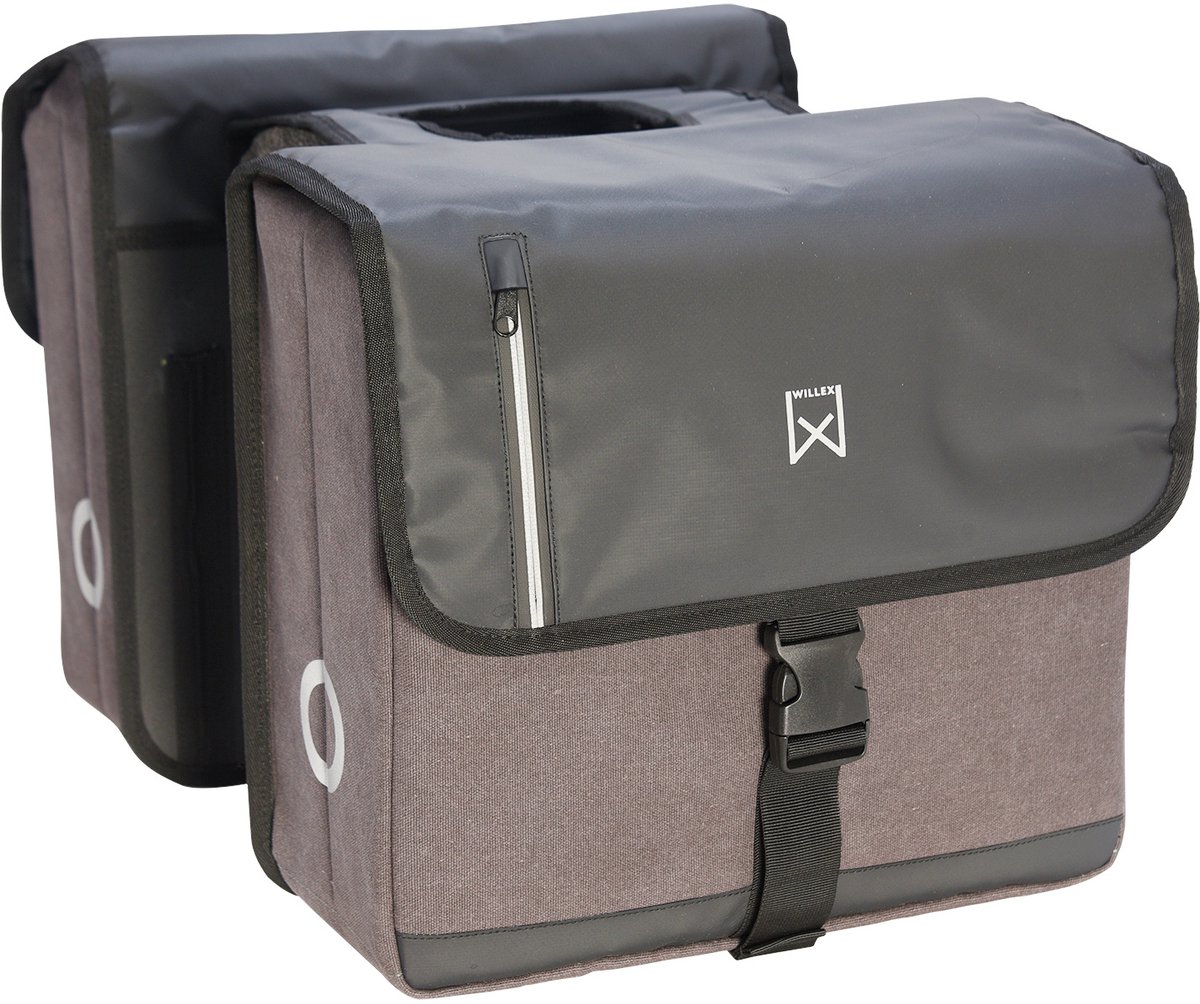 De Willex Dubbele Business fietstas is supersterk en mooi in eenvoud. De twee ruime compartimenten van de tas zijn samen goed voor 40 liter inhoud. De tas is gemaakt van waterdicht katoenen canvas, met reflectie. Het stevige canvas maakt deze dubbele fietstas elegant en sterk tegelijk. Bovendien is dit katoenen canvas waterafstotend. Om inregenen te voorkomen is de klep van de tas voorzien van regenflappen. Ook de binnenkant is bestand tegen vocht, dankzij de voering van waterdichte stof. In de klep van de tas zit een klein opbergvakje met een ritssluiting.