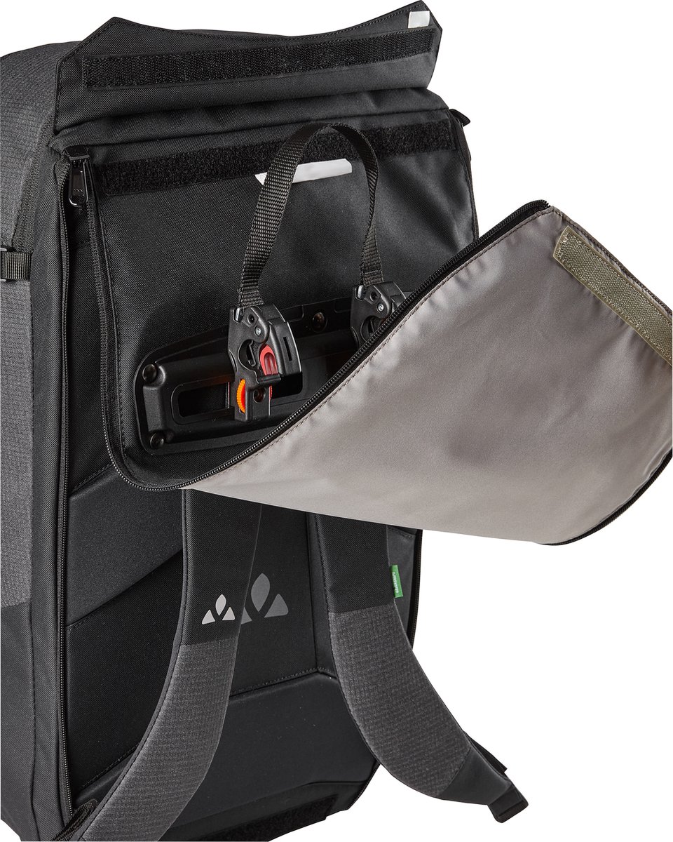Rugzak of fietstas? Gewoon allebei! Hij is de ideale begeleider voor forenzen, die tijdens het fietsen hun tas stevig op de fiets willen, maar dan in de trein, bus of de universiteit als rugzak willen dragen. De tas wordt met behulp van QMR-haken die met een slot te vergrendelen zijn (bijv. TSA slot, niet inbegrepen),aan de bagagedrager bevestigd en is in een handomdraai tot rugzak omgebouwd. Daarvoor worden de beide verticale ritssluitingen geopend en het gehele bevestigingssysteem in een met klittenband afgesloten vak opgeborgen. Deze slimme rugzak-fietstas-combinatie biedt echter nog meer. In het hoofdvak is ruimte voor DIN A4-documenten, een drinkfles en een snack, evenals reservekleding. Een apart, met ritssluiting af te sluiten, gepolsterd vak herbergt laptops tot 15,6"". Een vak dat over de gehele voorzijde loopt opent diagonaal en bevat een gaas-organizer voor mobiel, sleutels en portemonnee. Op dit vak bevindt zich een plat gaasvak voor het snel opbergen van tijdschriften of natte kleding. Twee compressieriemen, een helmhouder en de meegeleverde regenhoes ronden de comfortuitrusting af. Het basismateriaal van de Cycle 28 Luminum bestaat uit 50% gerecycled polyester, het contrastmateriaal zelfs voor 100%. de emissies afkomstig van materialen, productieproces, verzending werden holistisch bepaald en systematisch verminderd.