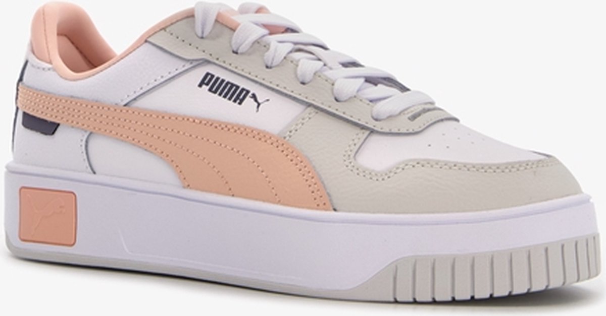 Witte Puma Carina Street sneakers voor kinderen. Gemaakt van imitatieleer met een binnenwerk van textiel en een plateauzool van rubber. Voorzien van een vetersluiting voor een fijne pasvorm. Het comfortabele voetbed is gemaakt Soft Foam en is uitneembaar zodat je eventueel jouw eigen zolen in de schoenen kan dragen. Deze gave sneakers worden versierd met rozee en beige details en merkopdrukken. lees meer over dit product
