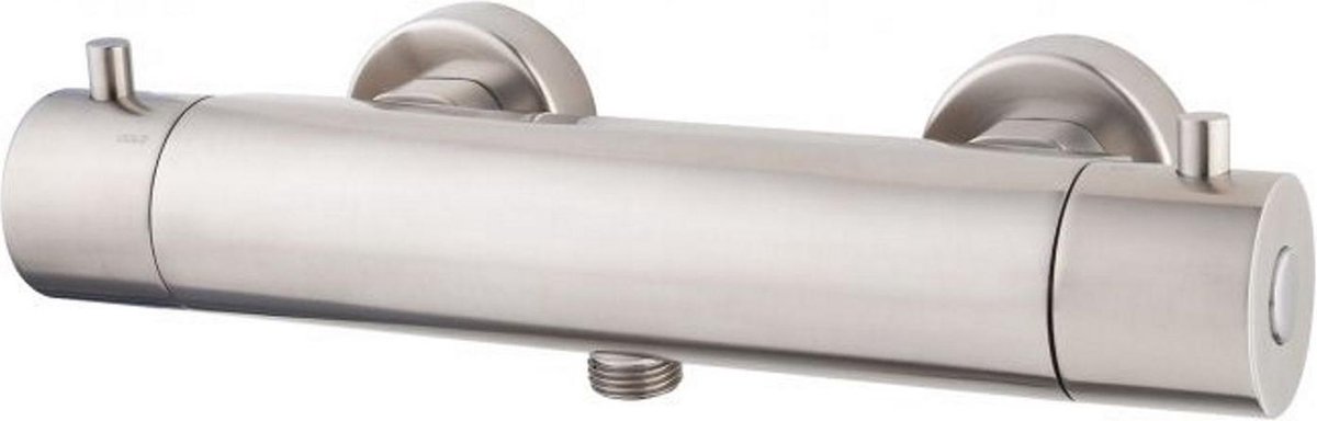 Douchethermostaat Wiesbaden Cool Touch Geborsteld Staal RVS Met deze douchethermostaat van Wiesbaden kan iedereen veilig douchen. De kraan is namelijk voorzien van cool touch. De kraan blijft koel en u kunt zich er dus niet aan verbranden. Ook heeft de kraan temperatuurblokkering bij 38 graden. Om water warmer dan 38 graden uit de kraan te krijgen, drukt u een knop in. Deze douchethermostaat bedient u met twee draaiknoppen. Me... lees meer over dit product