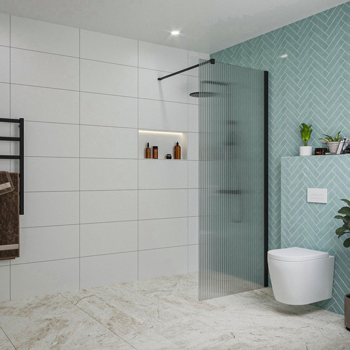 De Fortifura Galeria inloopdouche straalt stijl en elegantie uit dankzij het gebruik van ribbelglas en mat zwart. Het ribbelglas zorgt voor privacy en een subtiele decoratieve touch, terwijl de mat zwarte afwerking een eigentijdse uitstraling geeft. Deze inloopdouche is perfect voor wie op zoek is naar een moderne en verfijnde toevoeging aan hun badkamer.