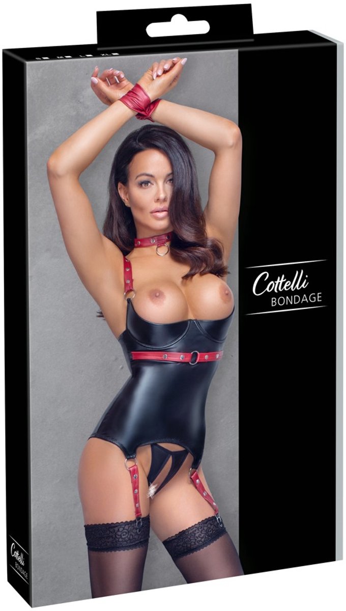 Openvallende jarretel chemise en kruisloze string van Cottelli BONDAGE in edele elastische matte look met bandjes, jarretels en tailleband (alleen voorkant) in rood met klinknagels bezet. Jarretel chemise met ingebouwde beugel lift, haaksluiting aan de achterkant. De riemen en bretels zijn verstelbaar voor een perfecte pasvorm. De string is helemaal open bij het kruis. Inbegrepen zijn een halsband en handboeien in bijpassend rood. De kraag heeft een ring aan de voorkant en kan worden aangepast met drukknopen voor een perfecte pasvorm. De eenvoudige manchet houdt de handen stijlvol en doeltreffend voor of achter het lichaam.