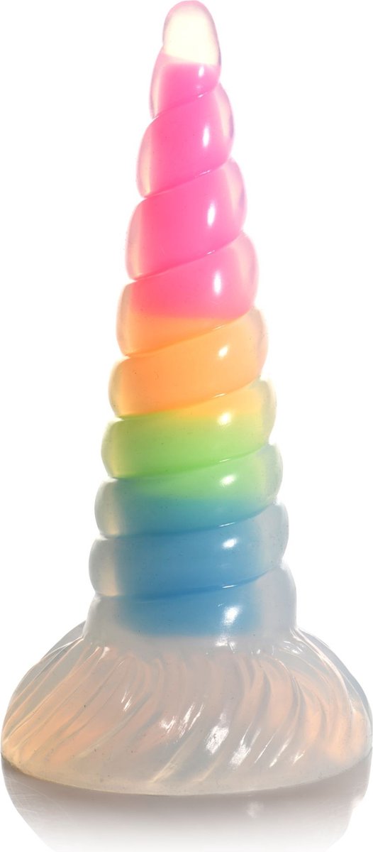 Bring your fantasies to life with this glow-in-the-dark unicorn! The transparent outer layer is a spiral horn with a tapered tip for easy insertion and a wide base. The rainbow core glows in the dark! Made of premium, flexible, phthalate-free silicone, this dildo is body-safe and best used with water-based lubricants. Enjoy hands-free pleasure thanks to the strong suction cup. Perfect for use with a partner for kinky cosplay o... lees meer over dit product