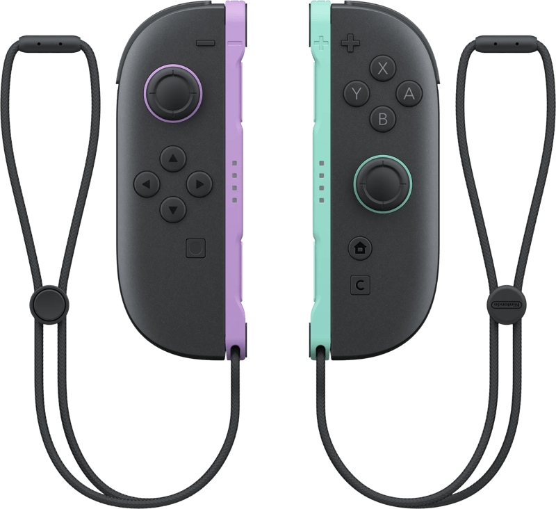 - Het Nintendo Switch 2-systeem wordt geleverd met een linker-Joy-Con 2 en een rechter-Joy-Con 2, en twee Joy-Con 2-polsbandjes.