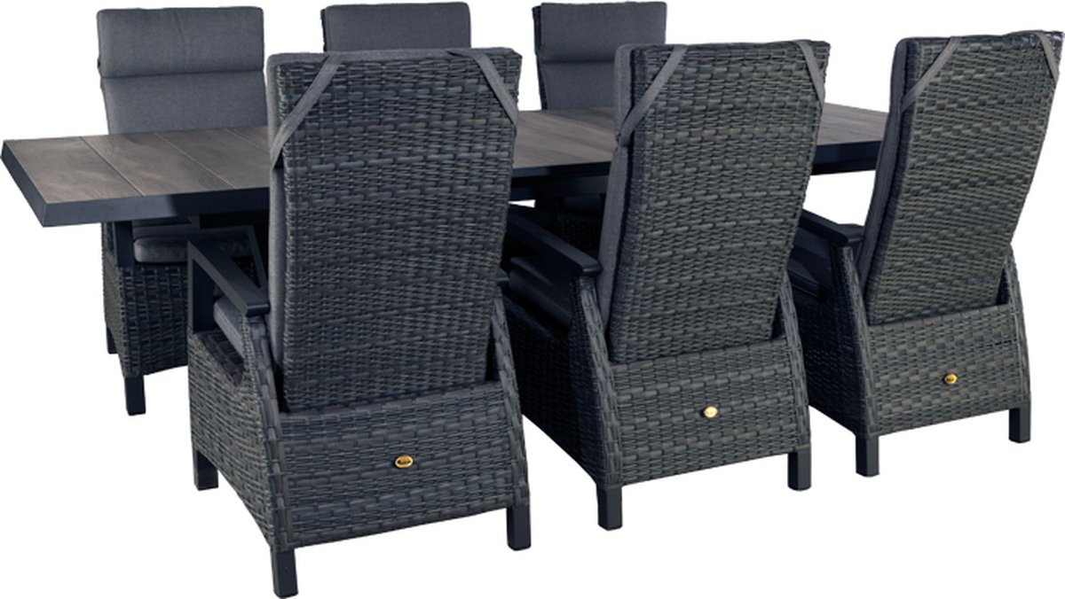 Dining set East Haven Midnight Grey. Dining set East Haven Midnight Grey. Dining set East Haven Midnight Grey is een stijlvolle diningset van Oosterik Home. Deze set bestaat uit 6 verstelbare stoelen met mooi vlechtwerk en inclusief kussens. Daarnaast een uitschuifbare tafel van 202 - 264 x 100 x 77 cm. Uit onze collectie Tuinmeubelen. Dining set East Haven Midnight Grey, dit komt uit het assortiment Tuinmeubelen, koop hem gem... lees meer over dit product